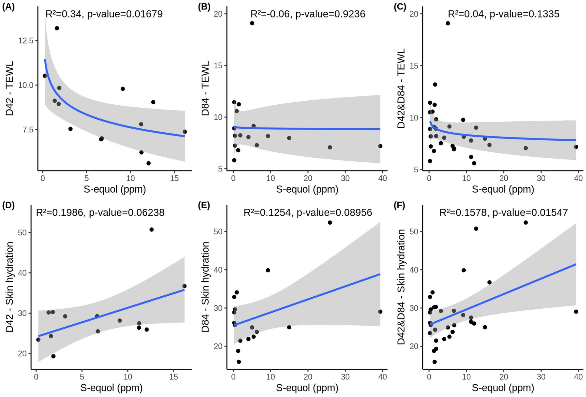 Figure 6. S-equol levels and two skin health parameters—TEWL (transepidermal water loss) (A) at Days 42, (B) at Days 84 and (C) over time (D42&D84) and skin hydration D) at Days 42, (E) at Days 84 and (F) over time (D42&D84). Data includes women that were used in the multiple regression model and had any detectable amount of S-equol in that time point (nD42 = 14, nD84 = 17, nD42&D84 = 31). Adjusted R2 and p-values obtained with F-test are depicted in the figures.