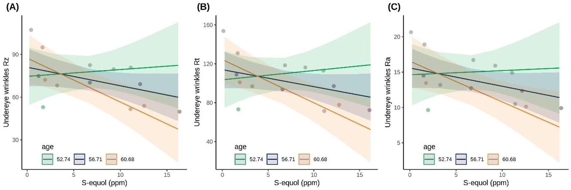 Figure 7. Scatterplots showing the association between S-equol concentration and undereye wrinkle parameters (A) Rz, (B) Rt, and (C) Ra on day 42 for S-equol producers (n = 14). Participants are divided into three age groups to visually interpret the interaction term of the linear model.