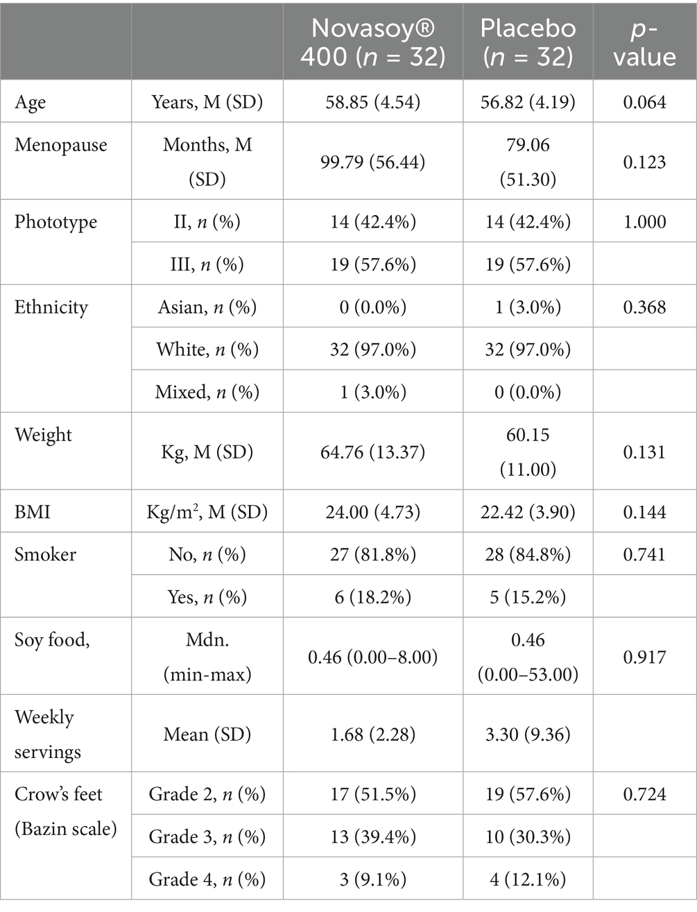 Second, we did not collect stool samples to evaluate the presence of S-equol producing bacterial species at baseline and therefore could not take into account S-equol producing status during randomisation. This may have resulted in S-equol producers being present in the placebo group who were inaccurately classified as non-producers, solely due to a lack of soy exposure during the study. This also prevented us from determining whether any women in the intervention group converted from non-producers to producers following Novasoy®400 intake. While we did evaluate habitual dietary soy intake at baseline, this cannot account for hidden soy consumption or early life exposure. A 2019 study of the French population reported that even soy non-eaters consumed 1.9 mg isoflavones per day, due to hidden soy in transformed foodstuffs (27). It is also well established that individuals who were regularly exposed to soy in early life are more likely to possess the gut bacteria to produce S-equol (17, 30). Future trials should establish S-equol status at baseline, incorporate it into stratification or subgroup analyses, and ideally collect stool samples to confirm the presence of equol-producing microbiota. In addition, it should be noted that baseline soy intake in our cohort was low (median 0.46 weekly servings), partially reflecting dietary patterns in Western populations, but limiting generalisability to other populations where soy consumption is substantially higher, e.g., east and south-east Asia. This context is important when interpreting our findings, as the skin benefits observed here may underestimate the magnitude of effect achievable in populations with higher habitual soy intake or greater prevalence of equol producers. Future studies should examine diverse populations, including those with higher baseline soy exposure, to better characterise the full range of isoflavone-related effects.