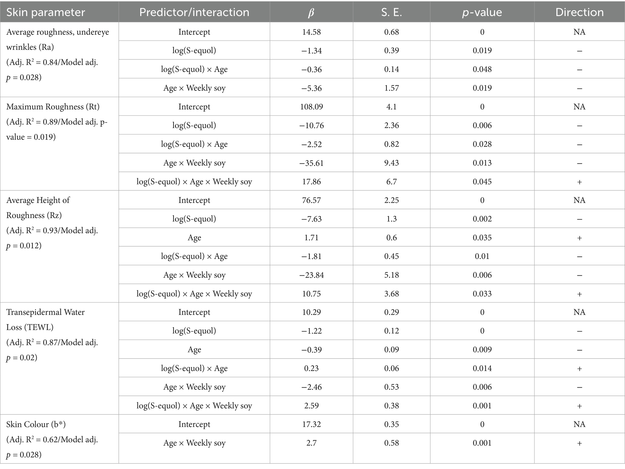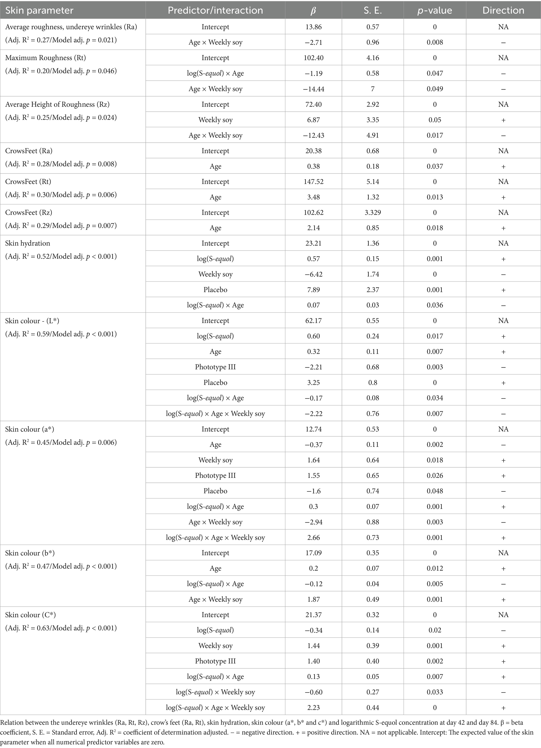 Multiple linear regression analysis examined the relationship between the skin parameters and various predictor variables (age, dietary soy intake, and skin phototype) and their interactions at D42, D84, and for both timepoints combined D42&84. In other words, independent predictor variables or the combinations of predictor variables (interactions) were tested for their association with the respective skin parameter. Of note, we used the log-transformed S-equol values to account for the wide variation in S-equol levels, which helped enhance the accuracy and reliability of the multiple linear regression model (Supplementary Table 4). The regression models were tested for statistical assumptions (Supplementary Table 5), and heteroskedasticity-consistent standard errors were calculated via the vcovHC method in R in case they did not met them, to improve the reliability of the coefficients obtained with the inference. The regression model was statistically significant for five different skin parameters at D42, six at D84 and 11 for combined D42&84. Tables 2–4 present only the statistically significant results of this analysis and how the various predictors or covariates: log(S-equol), age, weekly soy consumption, and their interactions influence the different skin parameters.