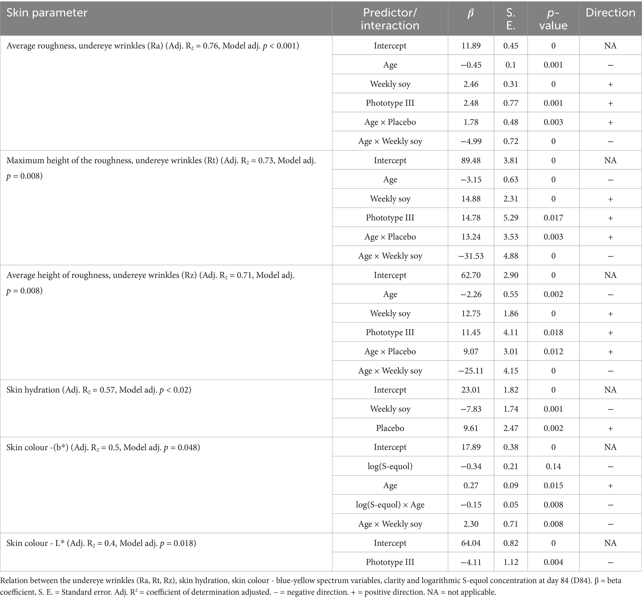 Table 3. Results of the multiple linear regression model showing the influence of age, weekly soy, phototype III, and placebo on skin parameters at D84.