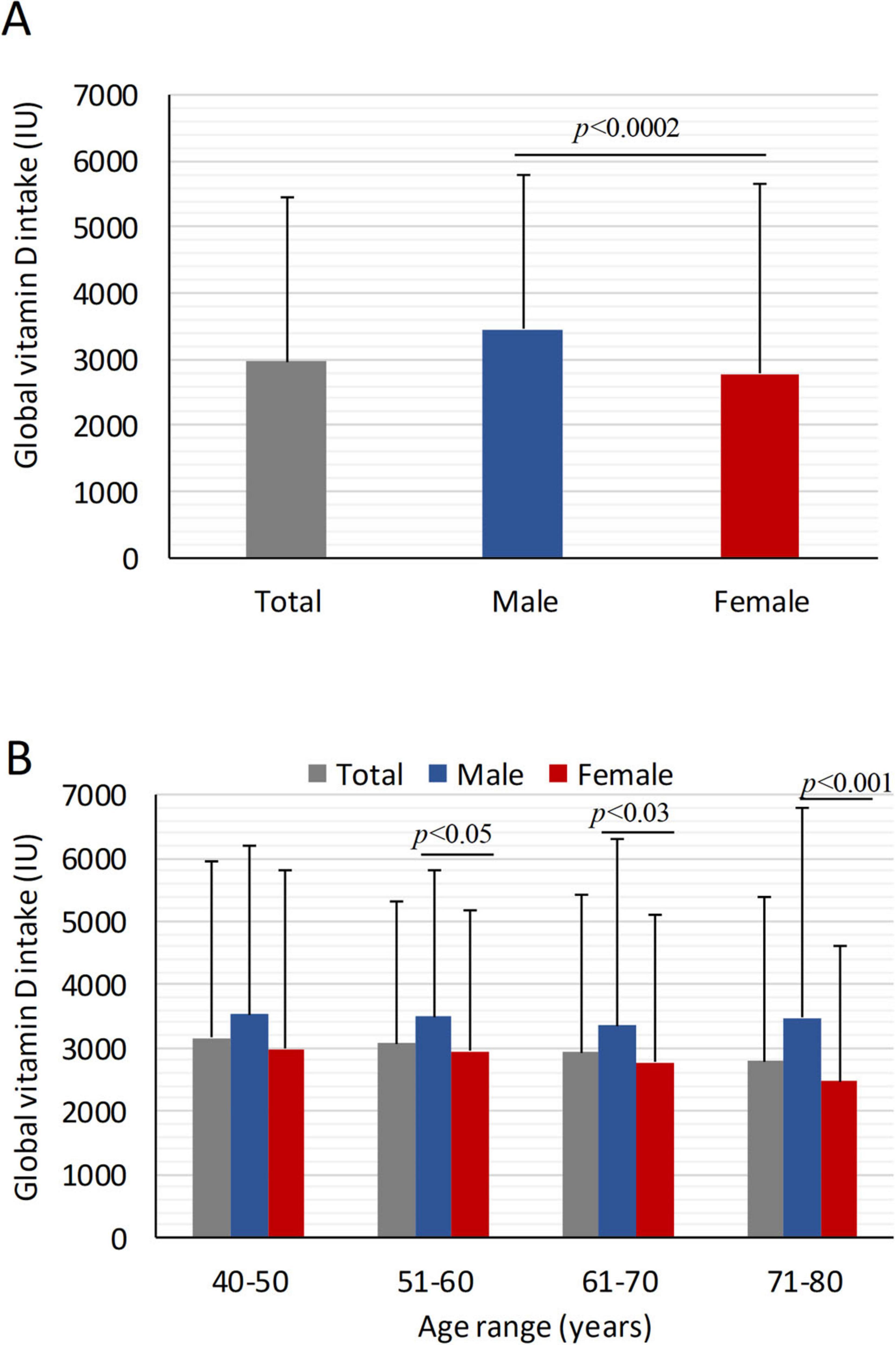 Figure 1. Mean global vitamin D intake in healthy subjects and patients with pathological disorders stratified by gender and age. Global mean vitamin D intake across age decades, stratified for males and females. (A) Mean global vitamin D intake over 14 days in all individuals, male and females; (B) Global mean vitamin D intake in over 14 days stratified by age decades and gender. The data reveal a progressive decline in vitamin D intake with age, particularly among females. Statistically significant differences between male and female groups for specific age ranges are indicated by p-values (p < 0.05, p < 0.03, p < 0.001, p < 0.0002). Data are presented as mean ± SD.
