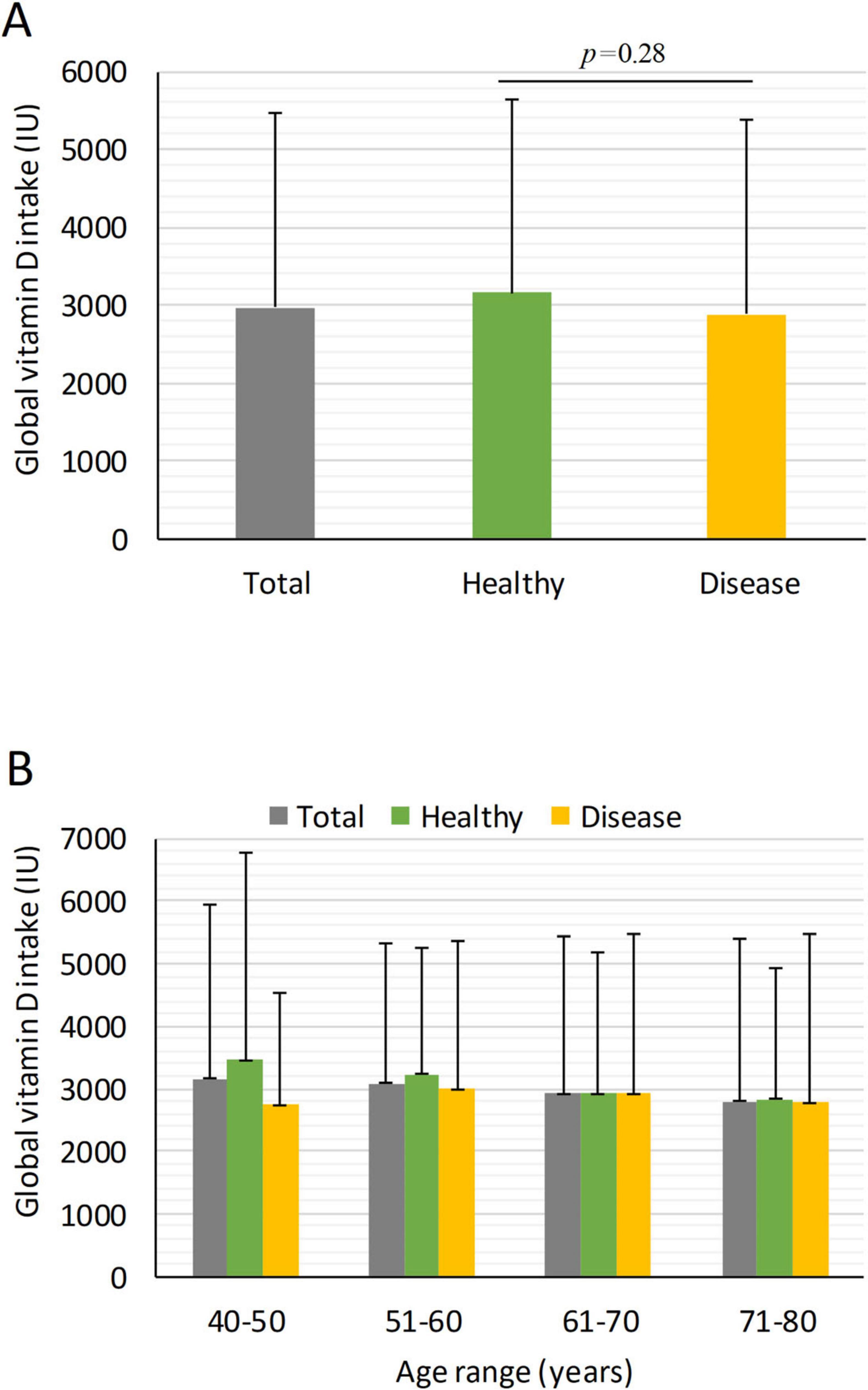 Figure 2. Mean global vitamin D intake in patients with pathological disorders stratified by age and gender. Global mean vitamin D intake across age ranges in patients affected by chronic pathological disorders. (A) Mean global vitamin D intake over 14 days in all individuals, and healthy and individuals with chronic disease; (B) Global mean vitamin D intake in over 14 days stratified by age decades and healthy/disease subgroups. Data are presented as mean ± SD.