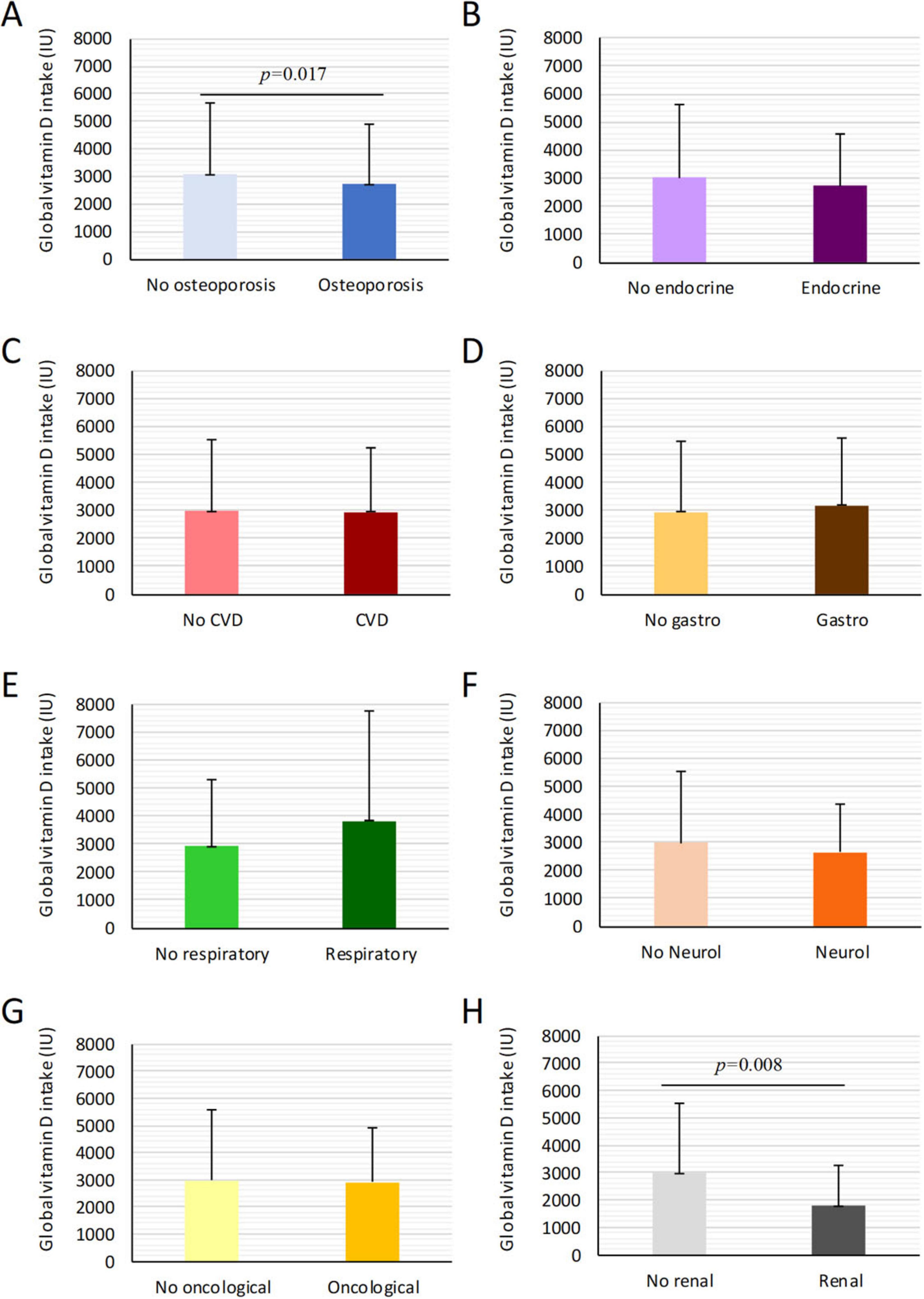 Figure 3. Mean global vitamin D intake in patients with and without specific pathological conditions. Comparison of mean global vitamin D intake among patients with various pathological conditions. (A–H) Represent different diseases including osteoporosis, renal disorders, oncologic, neurological, and endocrine conditions. Significantly lower vitamin D intake is noted in osteoporotic and renal groups, with p-values indicating statistical differences: p = 0.017 and p = 0.008. Data are presented as mean ± SD.