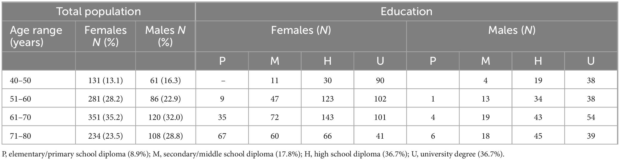 Table 1. Features of population included in the study, divided for both males and females into age decades, and educational degree.