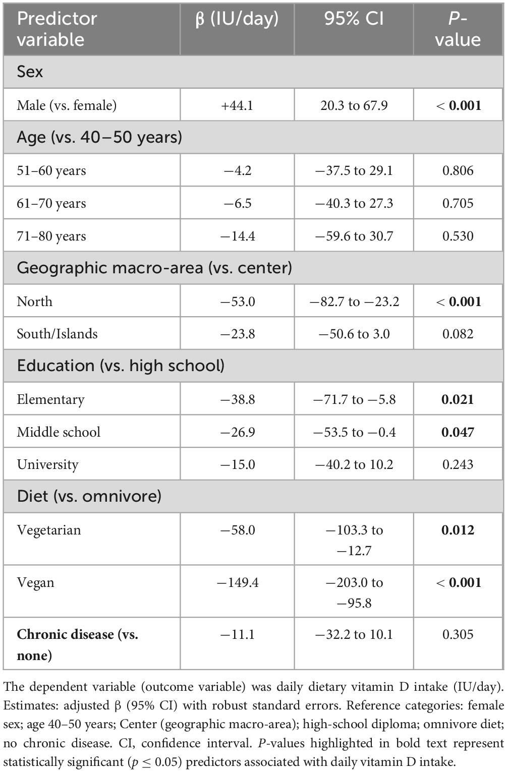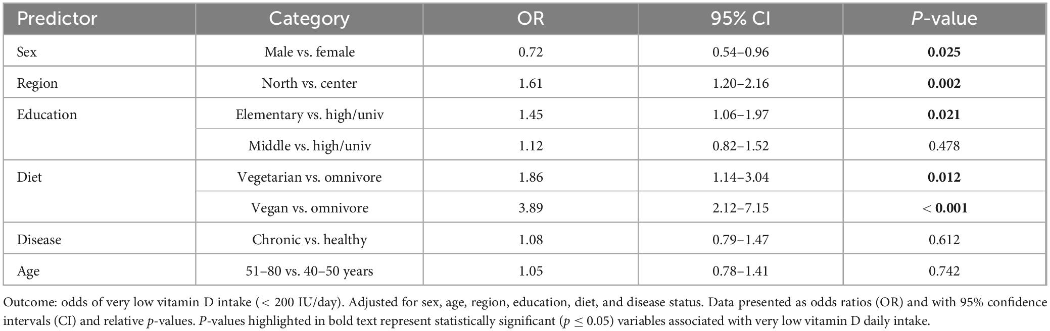 Analyses adjusting for multiple factors showed that male sex was independently associated with higher vitamin D intake, while residence in Northern Italy, lower education levels, and vegetarian or vegan diets were linked to significantly lower intake. Logistic regression further indicated that men had reduced odds of very low intake (< 200 IU/day), whereas Northern residence, low education, and vegetarian or vegan diets substantially increased this risk.