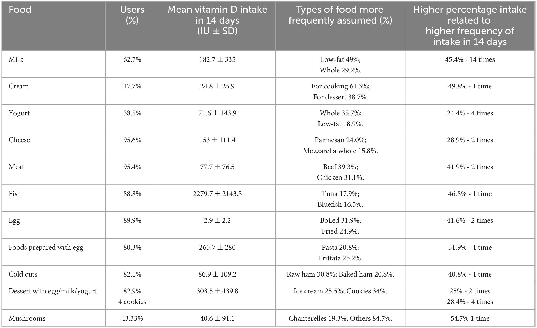 Table 3. Food-specific vitamin D intake: user frequency, consumption patterns, and 2 weeks intake estimates.