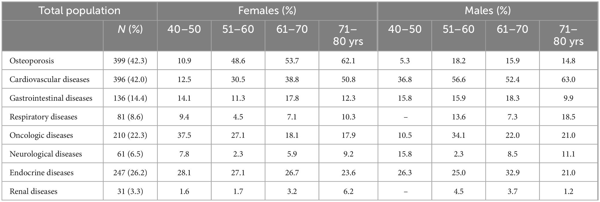 Overall, no significant difference was observed among patients with chronic diseases, osteoporosis and cardiovascular diseases were more common in older women (7th–8th decades), while cardiovascular diseases predominated among men in the 5th–7th decades (Table 4). Oncologic conditions were more frequently reported in middle-aged individuals.