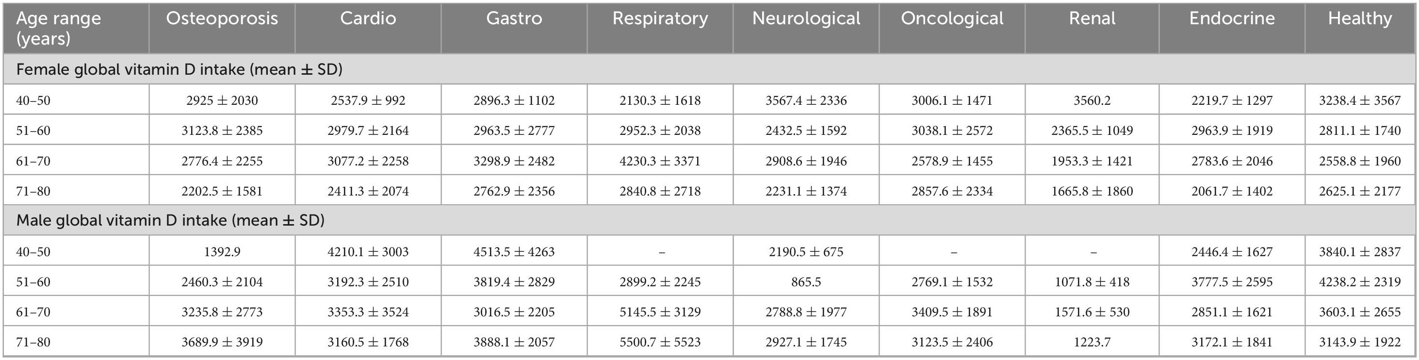 Among patients with pathological disorders, vitamin D intake was lower (2879 ± 2510 IU) than in healthy individuals (3151 ± 2481 IU), although the difference was not statistically significant (Figure 2). However, patients with osteoporosis (2543.1 ± 1904.4; 95% CI: 2293.9–2793.2 IU), and renal disorders (2210.7 ± 1711.6; 95% CI: 1929.2–2492.2 IU) had significantly lower intake than healthy individuals (p = 0.017 and p < 0.008, respectively) (Figure 3). In women, osteoporotic patients had a significant age-related decline in intake (p < 0.01) (Table 5). Overall, daily intake in most patient groups averaged around 200 IU/day or less, confirming critically low consumption levels.