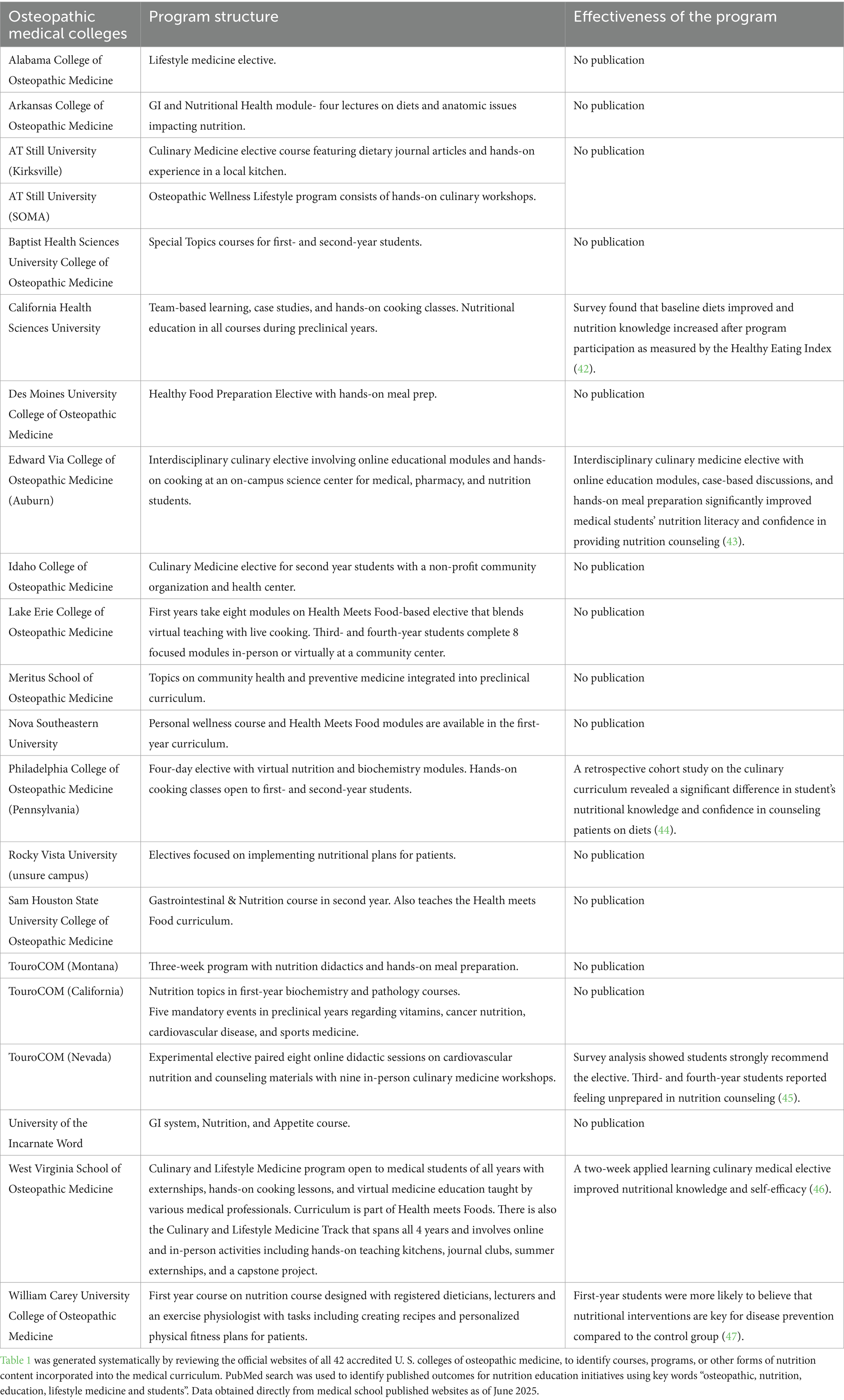 Although various institutions have initiated improvements, there remains no unified set of competencies or guidelines to structure nutrition education in osteopathic schools. Interactive and skill-based curricula have been shown to improve retention (17), while interprofessional approaches involving registered dietitians, culinary instructors, and behavioral health specialists enhance clinical relevance (18). However, the impact of these strategies has yet to be systematically evaluated. In a review of 42 U. S. accredited osteopathic colleges’ published websites across 68 campuses, eight out of 21 offered structured nutrition education and six have published outcome data (Table 1). Structured nutrition education are courses formally integrated into the medical curriculum and do not include stand-alone electives or optional workshops. Of these programs the majority rely on brief modules or electives rather than longitudinal integration. This shows that the absence of evaluation methods and national oversight limits scalability. Without consistent infrastructure, faculty development, and curricular alignment, osteopathic students remain variably equipped to provide nutrition-informed care.