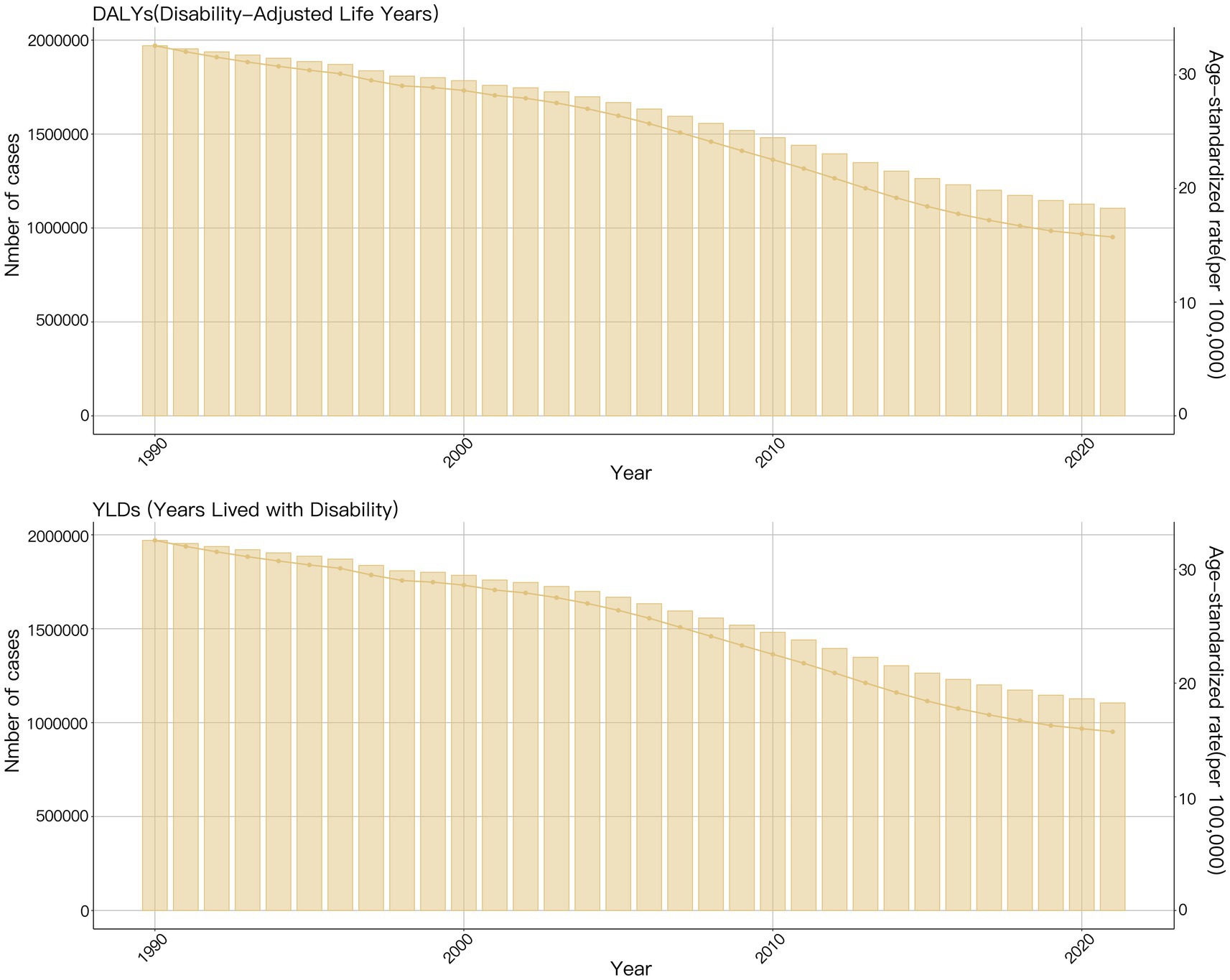 25. GBD 2021 Diseases and Injuries Collaborators. Global incidence, prevalence, years lived with disability (YLDs), disability-adjusted life-years (DALYs), and healthy life expectancy (HALE) for 371 diseases and injuries in 204 countries and territories and 811 subnational locations, 1990-2021: a systematic analysis for the global burden of disease study 2021. Lancet. (2024) 403:2133–61. doi: 10.1016/S0140-6736(24)00757-8