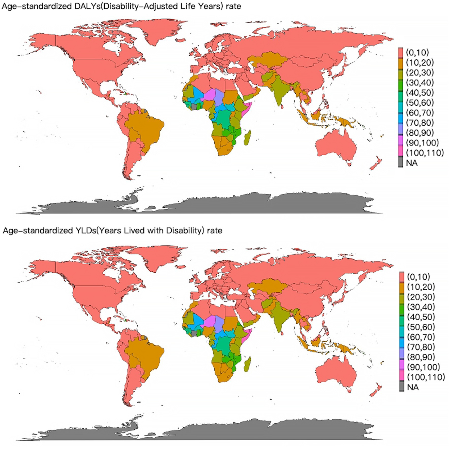 Figure 2. World map of the ASDR and ASYR of nutritional deficiencies attributable to vitamin A deficiency in 2021.
