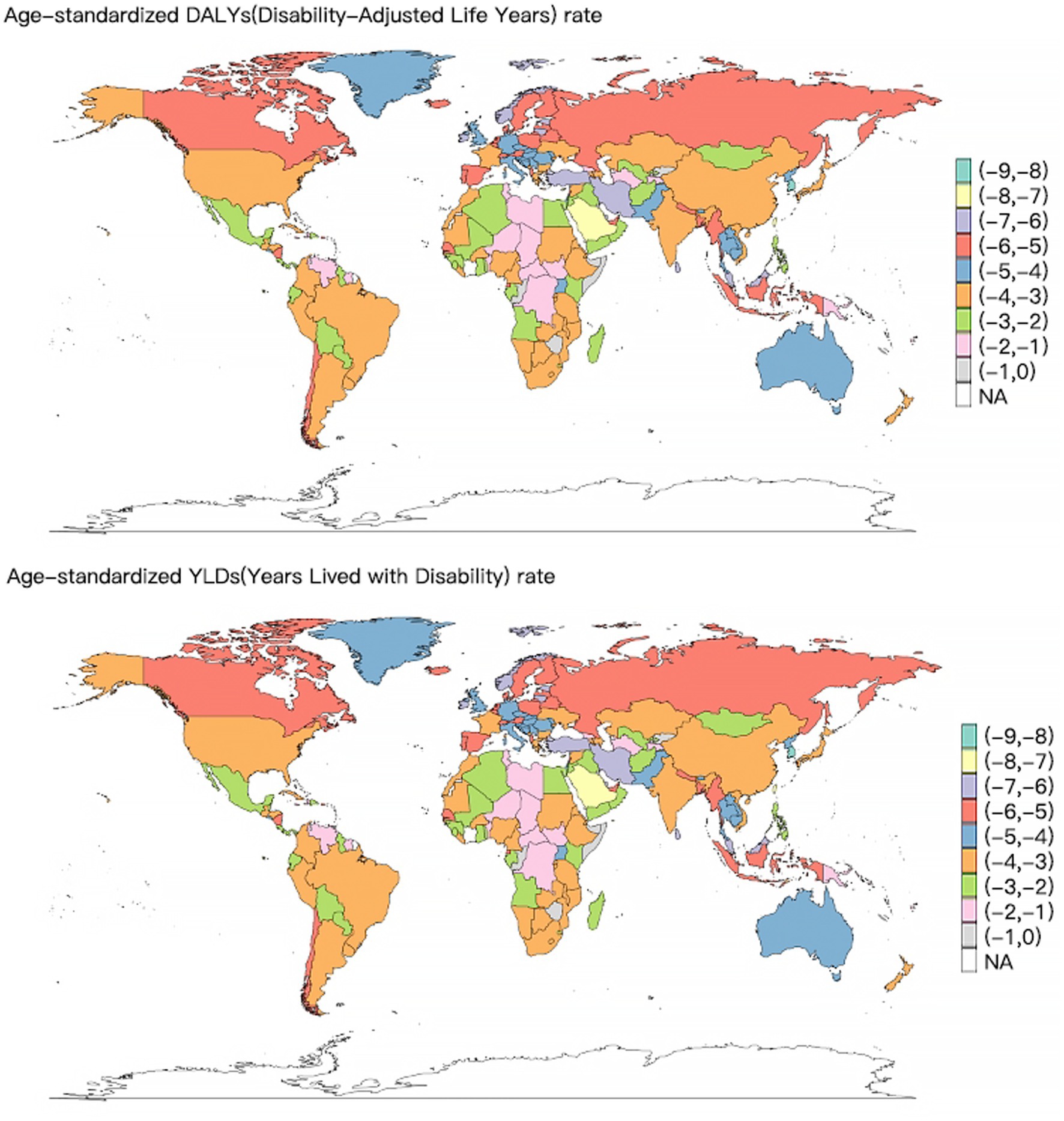Figure 3. World map of the EAPC of the ASDR and ASYR of nutritional deficiencies attributable to vitamin A deficiency from 1990 to 2021.