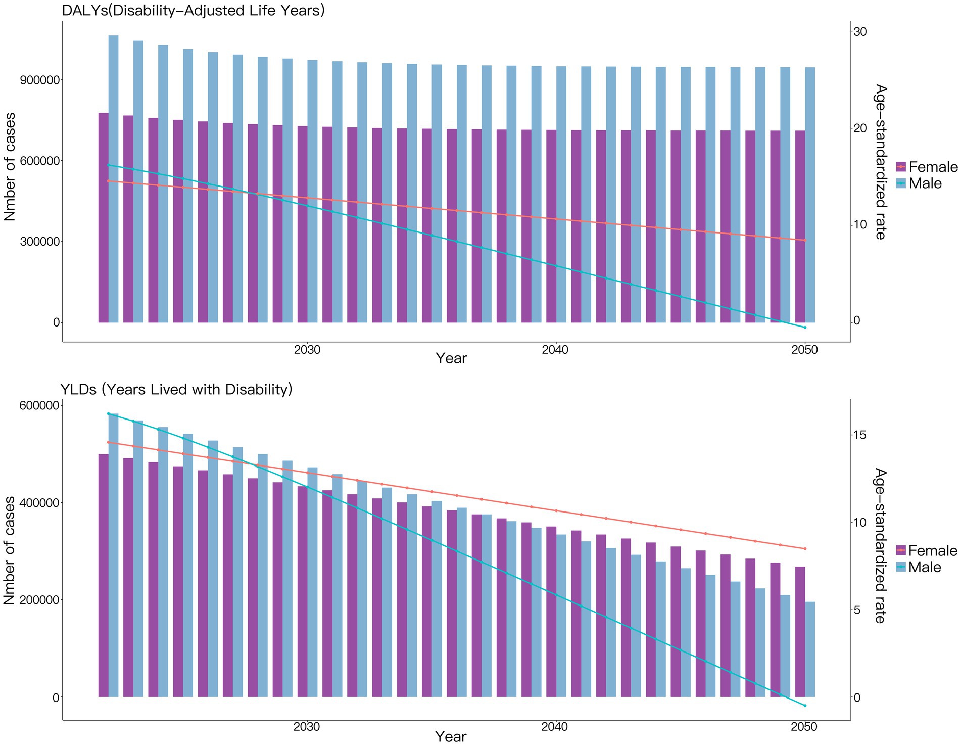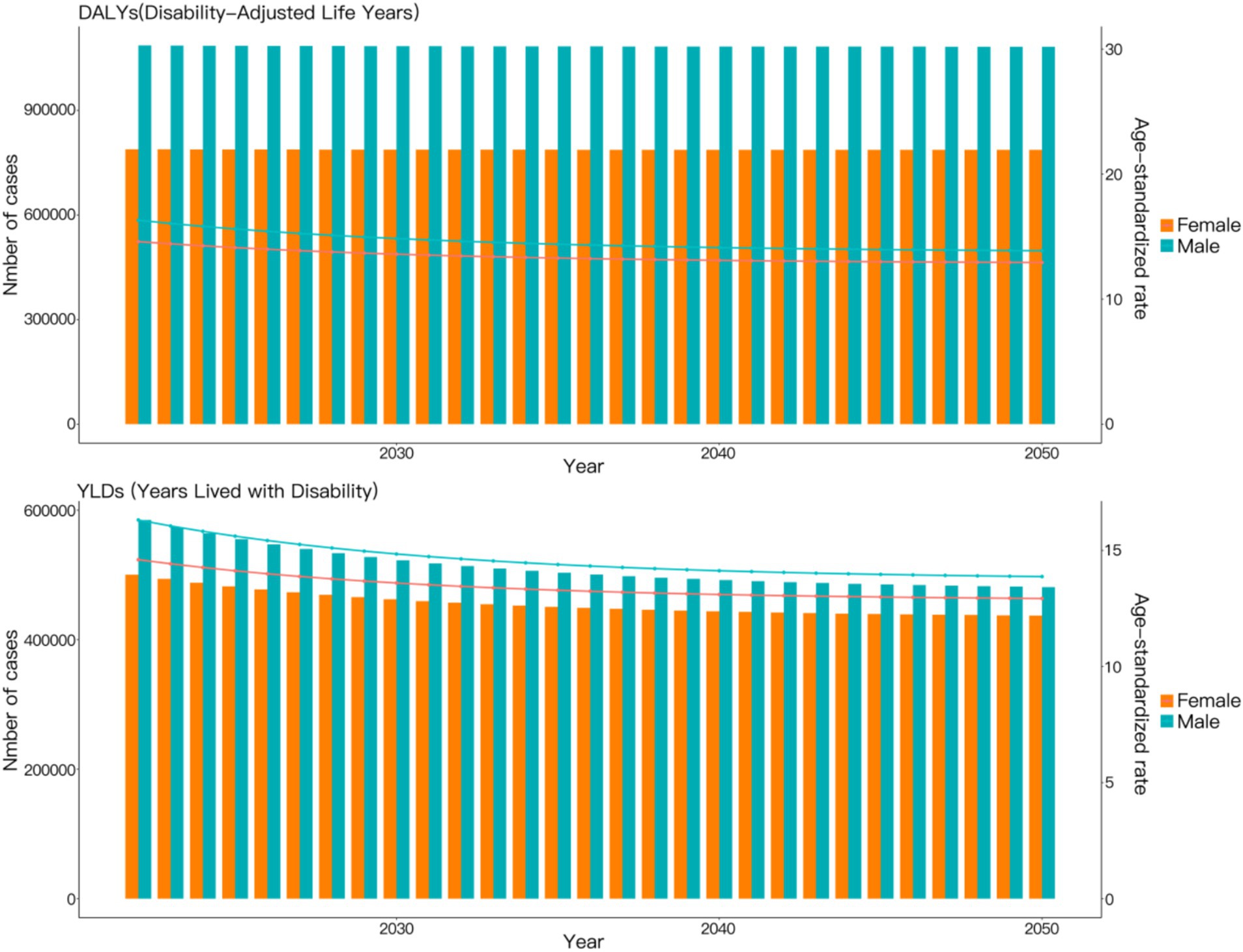 According to the prediction results of the ES model, differing from the predictions of the ARIMA model, the DALYs caused by NDs attributable to VAD are projected to remain almost unchanged for both males and females between 2022 and 2050. Additionally, the ASDR due to NDs attributable to VAD is expected to show only a slight decline during this period (Figure 5).