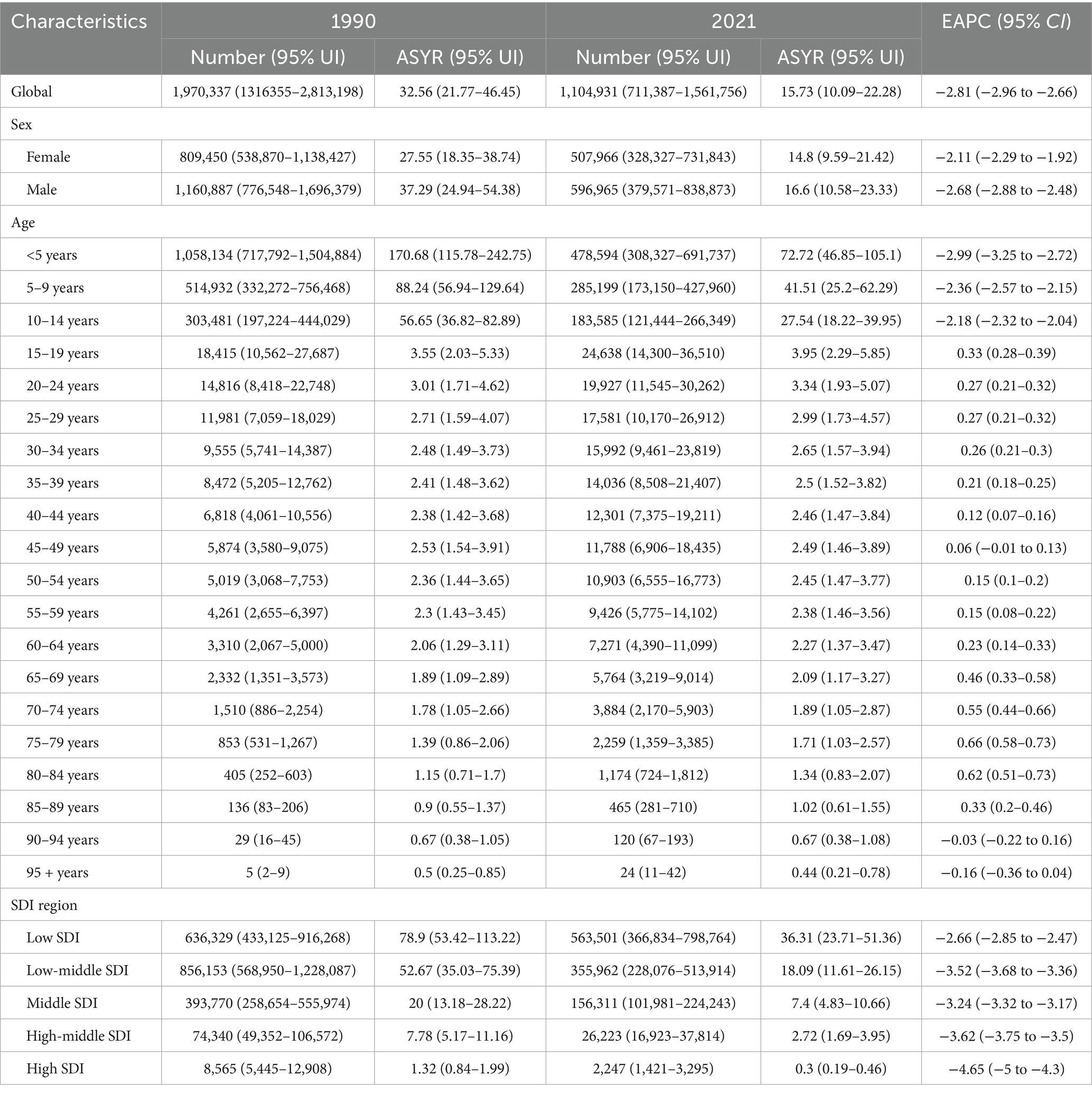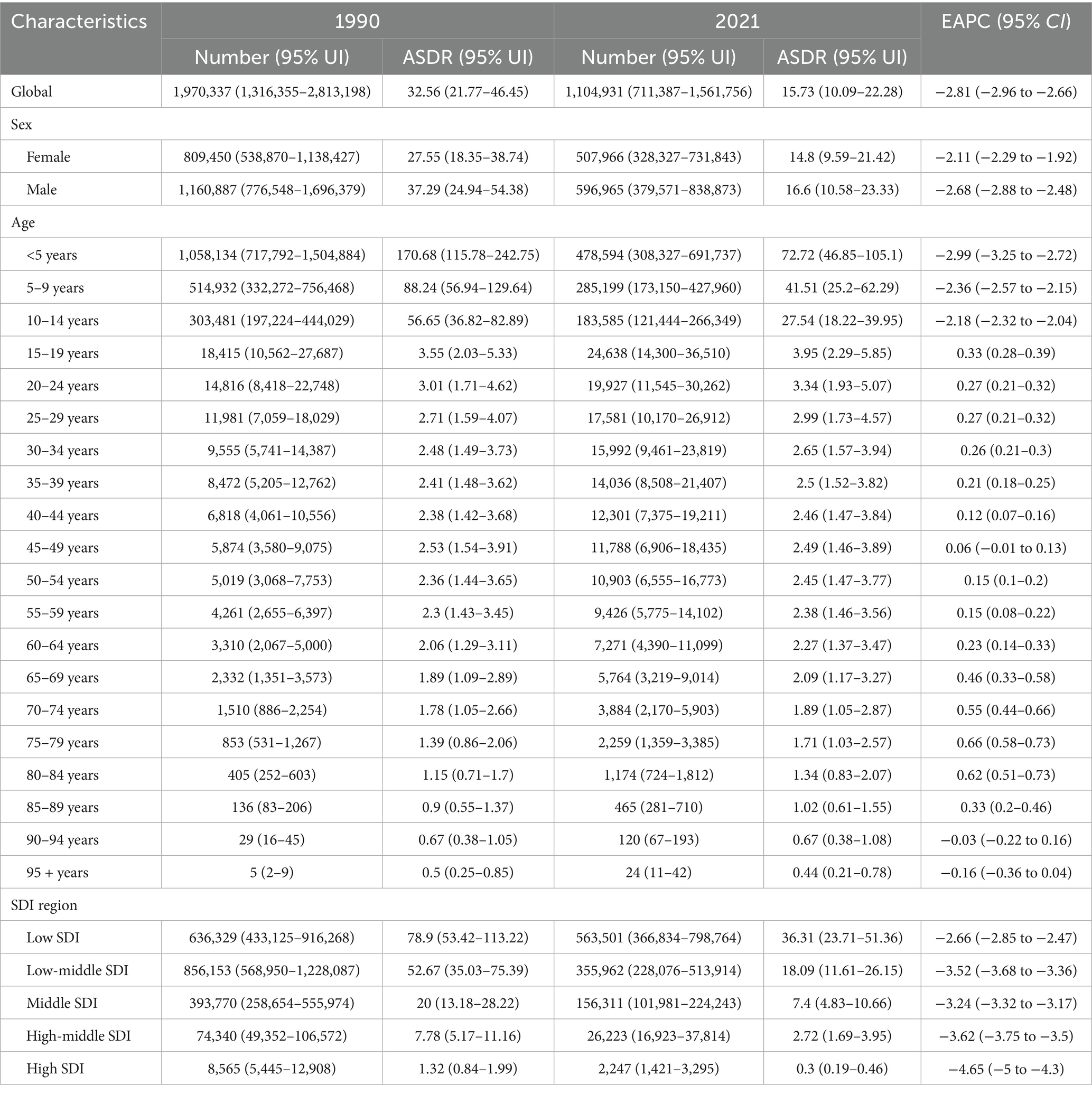Where denotes the th age group, represents age-specific rate, is the number of population (or weight) in the corresponding age groups of the selected reference standard population (26). Uncertainty intervals (UIs) were estimated based on the 2.5th and 97.5th percentiles derived from a 1,000-draw distribution for each metric (27). The SDI is a composite metric to evaluate a country or region’s overall socio-demographic development level based on fertility rates, educational attainment, and per capita income. It was used to classify regions and facilitate comparable analyses of disease burden. Countries and territories were classified into five groups according to their SDI scores as follows: low (SDI < 0.46), low-middle (SDI 0.46–0.60), middle (SDI 0.61–0.69), high-middle (SDI 0.70–0.81), and high (SDI > 0.81) (28). All statistical analyses were performed using R software (version 4.1.0), applying statistical significance defined as p < 0.05.