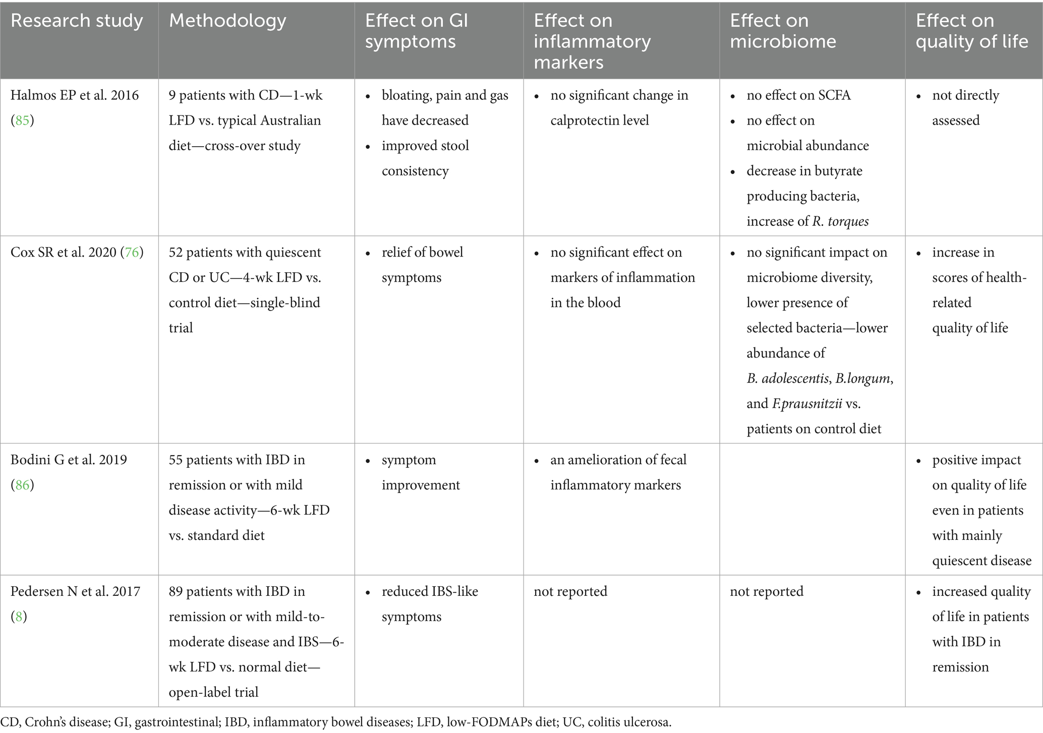 Referring to the efficacy of the LFD in patients with IBD, it is worth citing the study by Cox et al. (76) who conducted a randomized, controlled trial in a group of 52 patients with IBD in remission but with persistent intestinal symptoms, to investigate the effect of a 4-week intervention using the LFD on patients’ persistent intestinal symptoms, gut microbiome and circulating inflammatory markers. The researchers observed that 52% of those in the low LFD group reported an improvement in the severity of intestinal complaints compared to 16% in the control diet group. What is important, patients on the low-FODMAP diet exhibited significantly lower abundance of B. adolescentis, B. longum, and F. prausnitzii compared to those on control diet, which could have implications for the mucosal immune response and disease course, given the immune-regulatory functions of these bacteria, as previously discussed. It is important to note that these alterations coincide with the characteristic dysbiosis observed in IBD, including a reduction in the number of butyrate-producing species, as outlined in Section 3. Thus, although the LFD has been demonstrated to alleviate IBS-like symptoms, it may also exacerbate microbial imbalances that are considered to be a contributing factor to the pathogenesis of IBD (76). It can be hypothesized that these microbial alterations are a consequence of changes in colonic fermentable substrate. Bifidobacteria have been shown to preferentially ferment fructans and GOS, while F. prausnitzii uses them indirectly through cross-feeding (77). Moreover, in discussed study by Cox et al. patients observed an improvement in health-related quality of life, but no significant differences in microbiome diversity, clinical disease activity or inflammatory markers were observed (76).