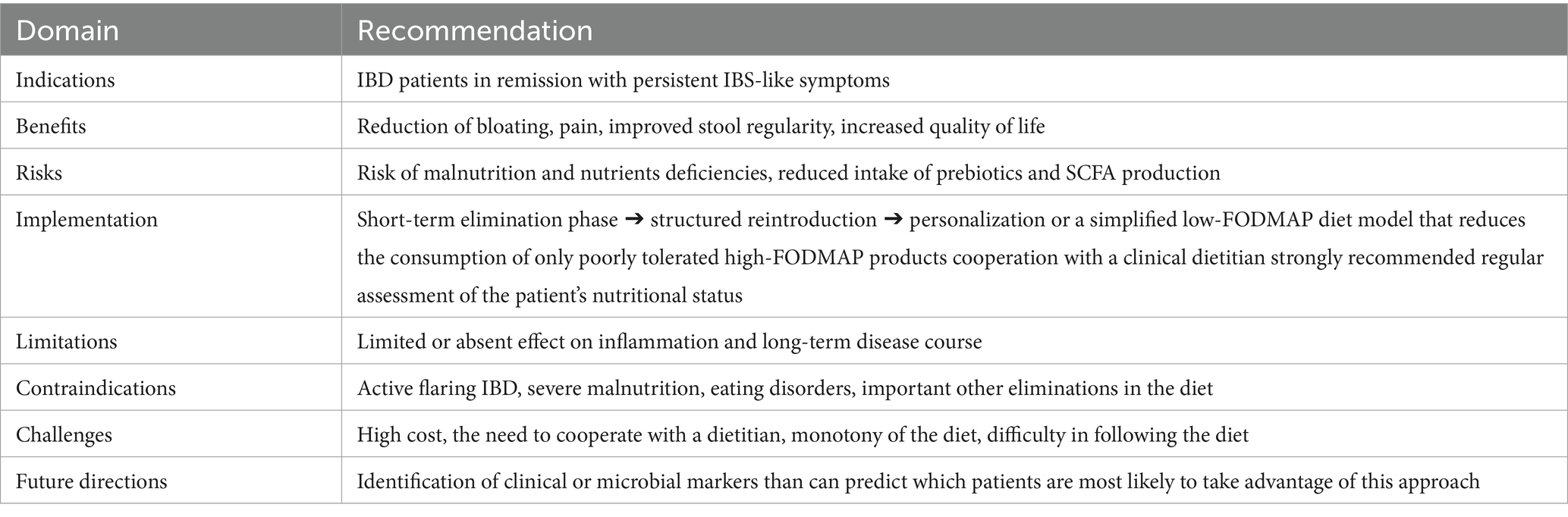 For these reasons, major societies such as the AGA underline that LFD should be used as a short-term approach, followed by structured reintroduction and subsequent return to a Mediterranean-style diet. The severity of many of these difficulties can be minimized by the patient’s collaboration with a qualified and experienced dietitian with periodic follow-ups (84). To sum up, Table 3 presents future directions and clinical implications for LFD use in the course of IBD.