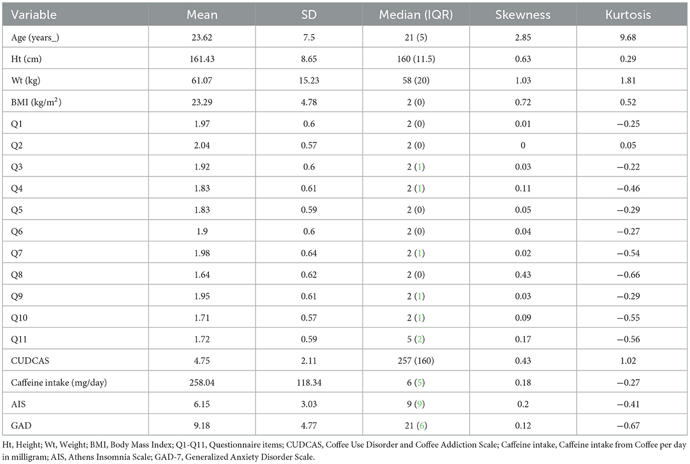 The CUDCAS showed a mean score of 4.75 (SD = 2.11) with positive skewness (0.43) and kurtosis (1.02), indicating a slight right-skewed distribution. Daily caffeine intake from coffee averaged 258.04 mg (SD = 118.34) with minimal skewness (0.18) and slight negative kurtosis (-0.27), suggesting a relatively normal distribution. Sleep quality, as measured by the AIS, had a mean score of 6.15 (SD = 3.03), while anxiety levels measured by the GAD-7 scale averaged 9.18 (SD = 4.77). Both AIS and GAD-7 scores showed low positive skewness (0.2 and 0.12, respectively) and negative kurtosis (−0.41 and −0.67, respectively), indicating approximately normal distributions with slightly flattened peaks (Table 1).