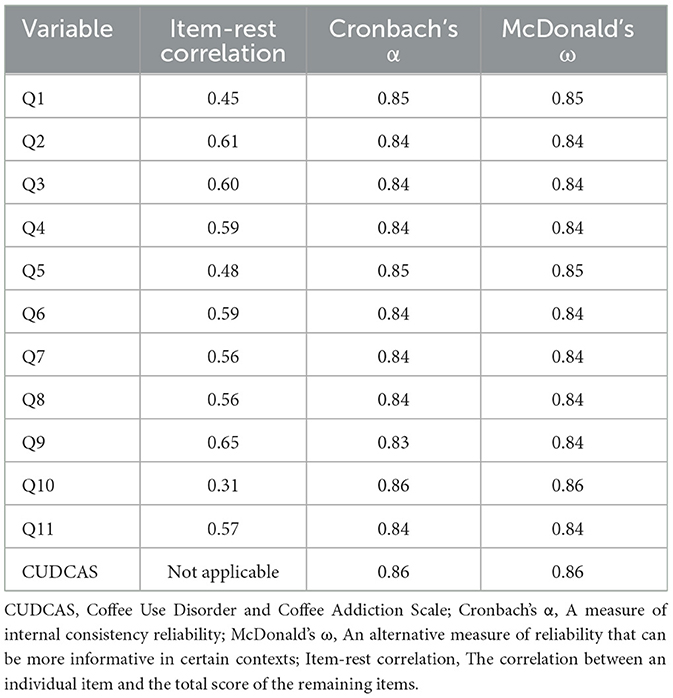 The “alpha if item deleted” analysis revealed that removing most items would result in minimal changes to the overall reliability, with Cronbach's α values ranging from 0.83 to 0.86 across individual items. The highest alpha values (0.86) were observed when Q1, Q5, or Q10 were hypothetically removed, suggesting these items contribute less to the overall internal consistency compared to other items. Conversely, removing Q9 would result in the lowest alpha value (0.83), indicating this item contributes most strongly to the scale's internal consistency. McDonald's ω values closely paralleled the Cronbach's α results, ranging from 0.84 to 0.86, providing additional confirmation of the scale's reliability. These findings support the use of the CUDCAS as a psychometrically sound instrument for measuring coffee use disorder and addiction symptoms in the study population.