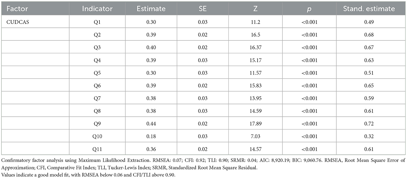 Table 3 presents the results of the CFA conducted to examine the factorial structure of the CUDCAS using maximum likelihood extraction. The analysis revealed that all 11 items loaded significantly onto a single factor (all p < 0.001), supporting the unidimensional structure of the scale. Factor loadings ranged from 0.18 (Q10) to 0.44 (Q9), with standardized estimates ranging from 0.32 (Q10) to 0.72 (Q9). The majority of items demonstrated moderate to strong factor loadings, with Q9 showing the highest loading (standardized estimate = 0.72), followed by Q2 (0.68) and Q3 (0.67). Q10 exhibited the weakest factor loading (standardized estimate = 0.32), consistent with its lower item-rest correlation observed in the reliability analysis.