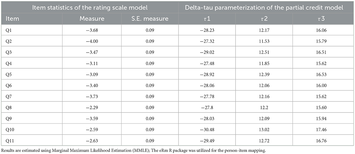 The threshold parameters (τ1, τ2, τ3) represent the difficulty of moving from one response category to the next for each item. The first threshold (τ1) values ranged from−30.48 (Q10) to−27.32 (Q2), indicating the difficulty of moving from the lowest to the second response category. The second threshold (τ2) values ranged from 11.53 (Q2) to 13.02 (Q10), representing the difficulty of moving from the second to the third response category. The third threshold (τ3) values ranged from 15.60 (Q8) to 17.46 (Q10), indicating the difficulty of moving from the third to the highest response category.