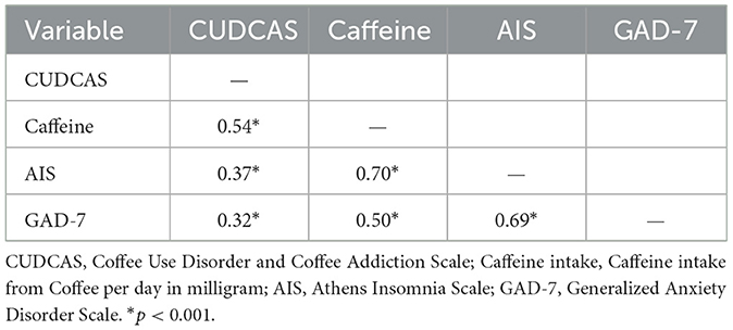 Table 6 presents the correlations among the primary study variables, including the CUDCAS, daily caffeine intake, insomnia symptoms (AIS), and anxiety symptoms (GAD-7). All correlations were statistically significant at p < 0.001, indicating robust associations between the variables. The strongest correlation was observed between caffeine intake and insomnia symptoms (r = 0.70), suggesting a strong positive relationship between daily caffeine consumption and sleep disturbances. This was followed by the correlation between insomnia and anxiety symptoms (r = 0.69), indicating a strong association between sleep problems and anxiety levels.