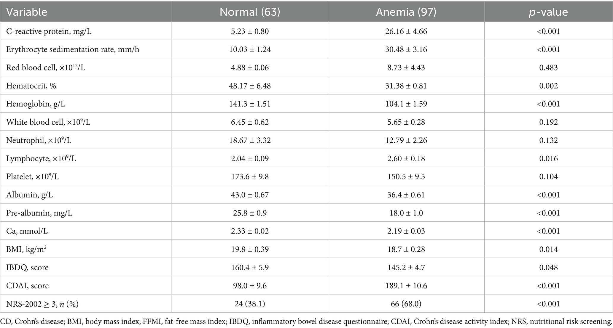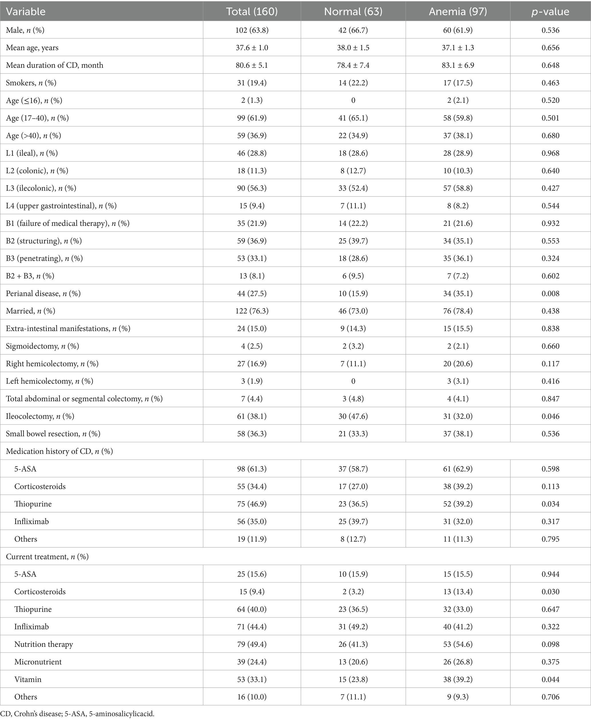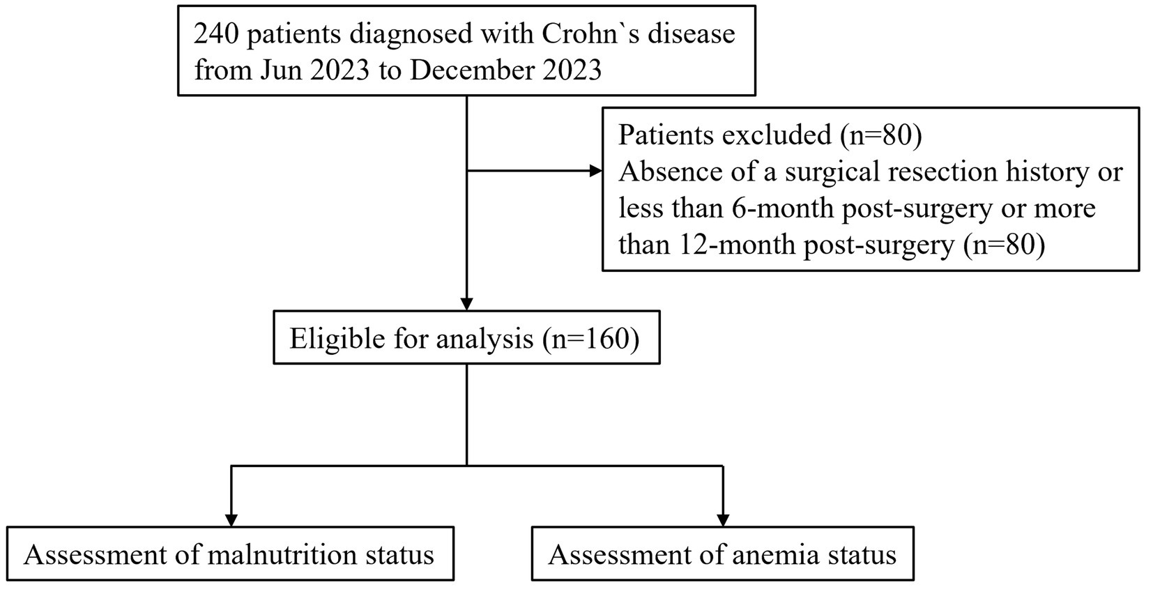 The study included patients with a radiologic, endoscopic, and histological diagnosis of CD, based on ECCO guidelines, who had undergone bowel resection due to complications or failure of medical therapy (11). A total of 160 CD patients with a history of surgery were recruited to evaluate their nutritional status and the prevalence of anemia post-surgery. This study was in accordance with the principles of the Declaration of Helsinki and was approved by the Ethics Committee of each participating hospital. Written informed consents were obtained from all patients enrolled in this study. A flow diagram was shown in Figure 1.
