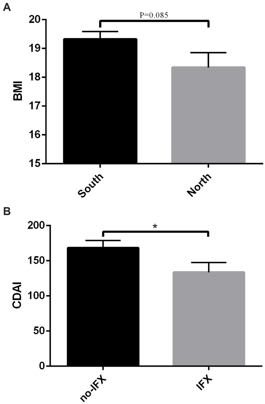 Figure 2. (A) The BMI of CD patients from Southern region and North region. (B) CDAI score of CD patients treated with infliximab and without infliximab. BMI, body mass index; CDAI, Crohn’s disease activity index; CD, Crohn’s disease. *P < 0.05.