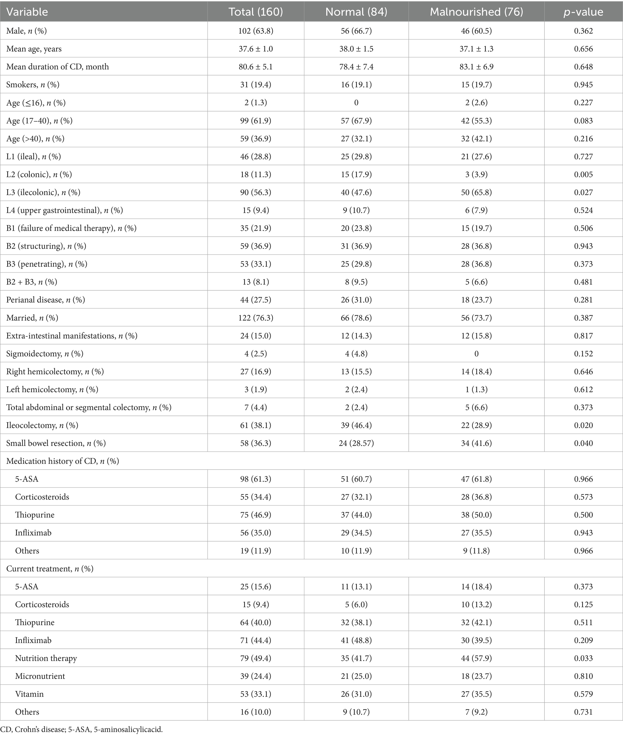Among the 160 CD patients, 102 (63.8%) were male and the mean age was 37.6 years. Thirty-one patients (19.4%) were smokers, and 122 (76.3%) were married. All patients had undergone surgical resection, with 2.5% sigmoidectomy, 16.9% right hemicolectomy, 1.9% left hemicolectomy, 4.4% a total or segmental colectomy, 38.1% ileocolectomy, and 36.3% small bowel resection. At the time of assessment, most patients were receiving thiopurine or infliximab therapy to prevent postoperative recurrence. Additionally, nearly half had undergone nutritional therapy following surgery, including oral nutritional supplements (ONS) and enteral nutrition (EN) delivered via nasogastric tube. Micronutrient and vitamin supplementation was administered to 24.4 and 33.1% of patients, respectively. Further details are presented in Table 1.