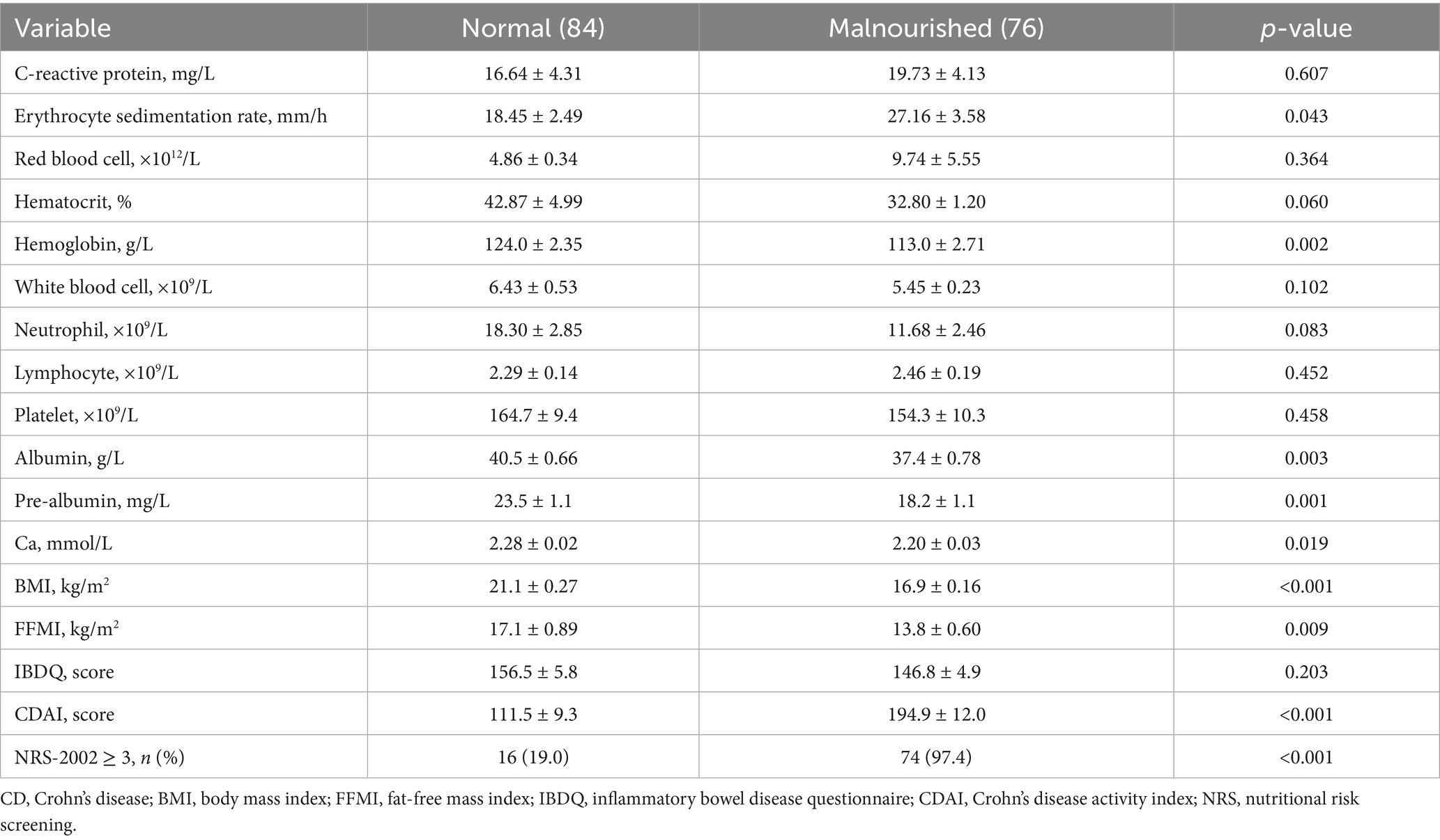 Although various medical therapies including immunosuppressive and biologic agents have emerged in recent years, surgical resection remains necessary for CD patients with medical therapy failure (26). Approximately 30% of CD patients require surgical resection within 5 years of diagnosis, and 70–80% will undergo CD-related surgery during their lifetime (19). However, surgery is not curative for CD, and thus post-surgical medical therapy remains essential. Tumor necrosis factor (TNF)-α monoclonal antibodies, such as infliximab, are widely used to induce and maintain remission in moderate to severe CD (27). To our knowledge, data on the impact of these therapies on post-surgical nutritional parameters are limited. In our study, we found that CD patients treated with infliximab postoperatively had lower CDAI score, higher BMI, and higher ALB level. These findings suggest that infliximab better controls disease activity. When patients achieve remission, they can eat without pain, nausea, or vomiting, which directly improves nutritional status. Our results are consistent with previous studies demonstrating that infliximab reduces inflammation, alleviates disease symptoms, and promotes mucosal healing, thereby enhancing nutritional status and body weight in post-surgical CD patients (28). What’s more, ALB acts as both a marker of nutritional status and systemic inflammation, we also analyzed ALB level between patients with CDAI >150 and patients with CDAI≤150, we found the ALB level was higher in patients with CDAI≤150 (41.5 ± 5.6 g/L vs. 38.0 ± 6.5 g/L, p = 0.007). Thus, disease activity is associated with ALB level, which indicated that other nutrition markers are needed in the future.