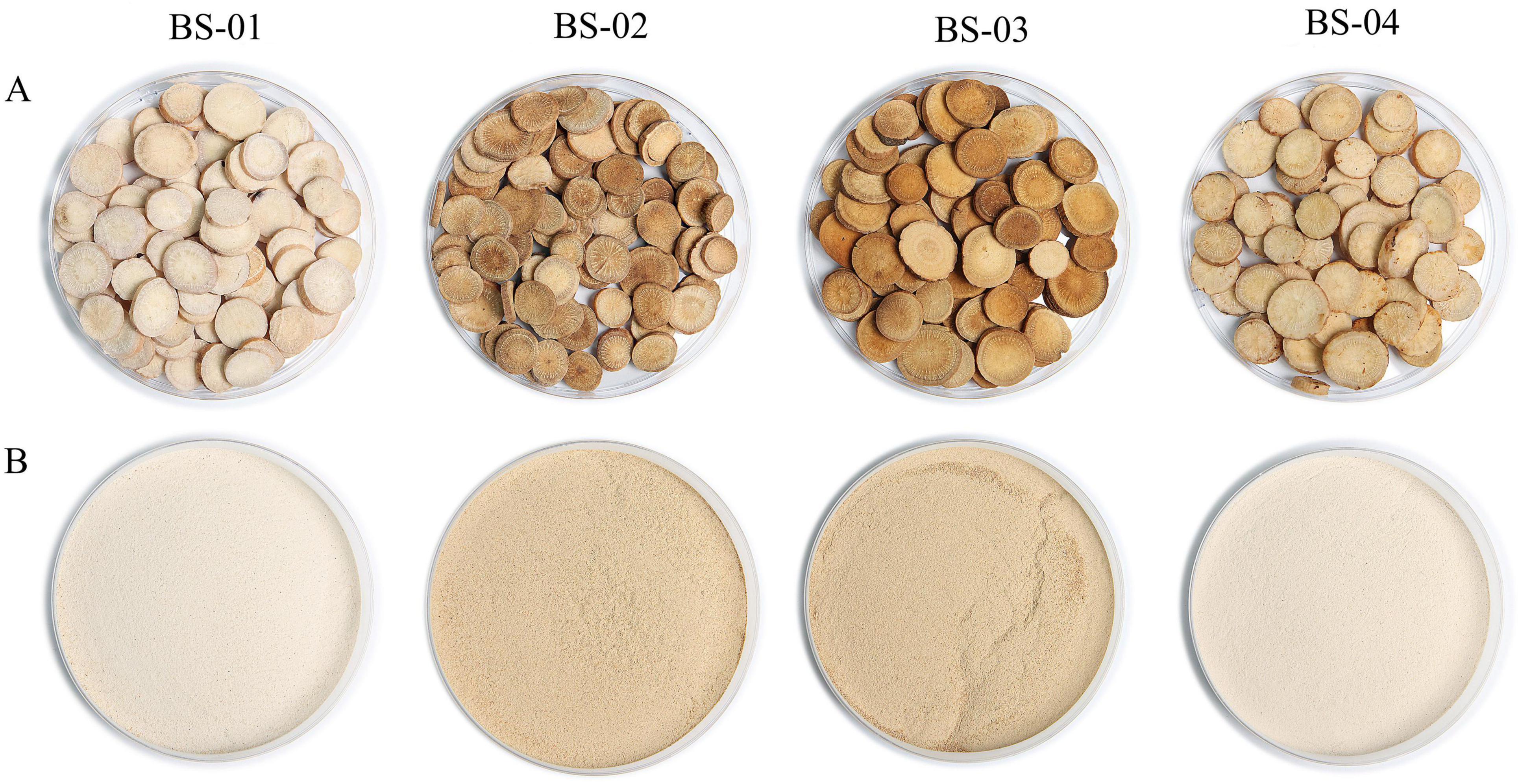 Paeoniae Radix Alba (stir-baked with bran) (150-160°C): First, heat the stir-baking container until 10 g of bran is lightly toasted and emits smoke. Next, add 100 g of PRA (prepared slices) as a single batch and stir-bake quickly until the surface turns yellow or dark yellow. Remove, sieve off the bran, let the sample cool, and crush to powder at once. Named BS-03.