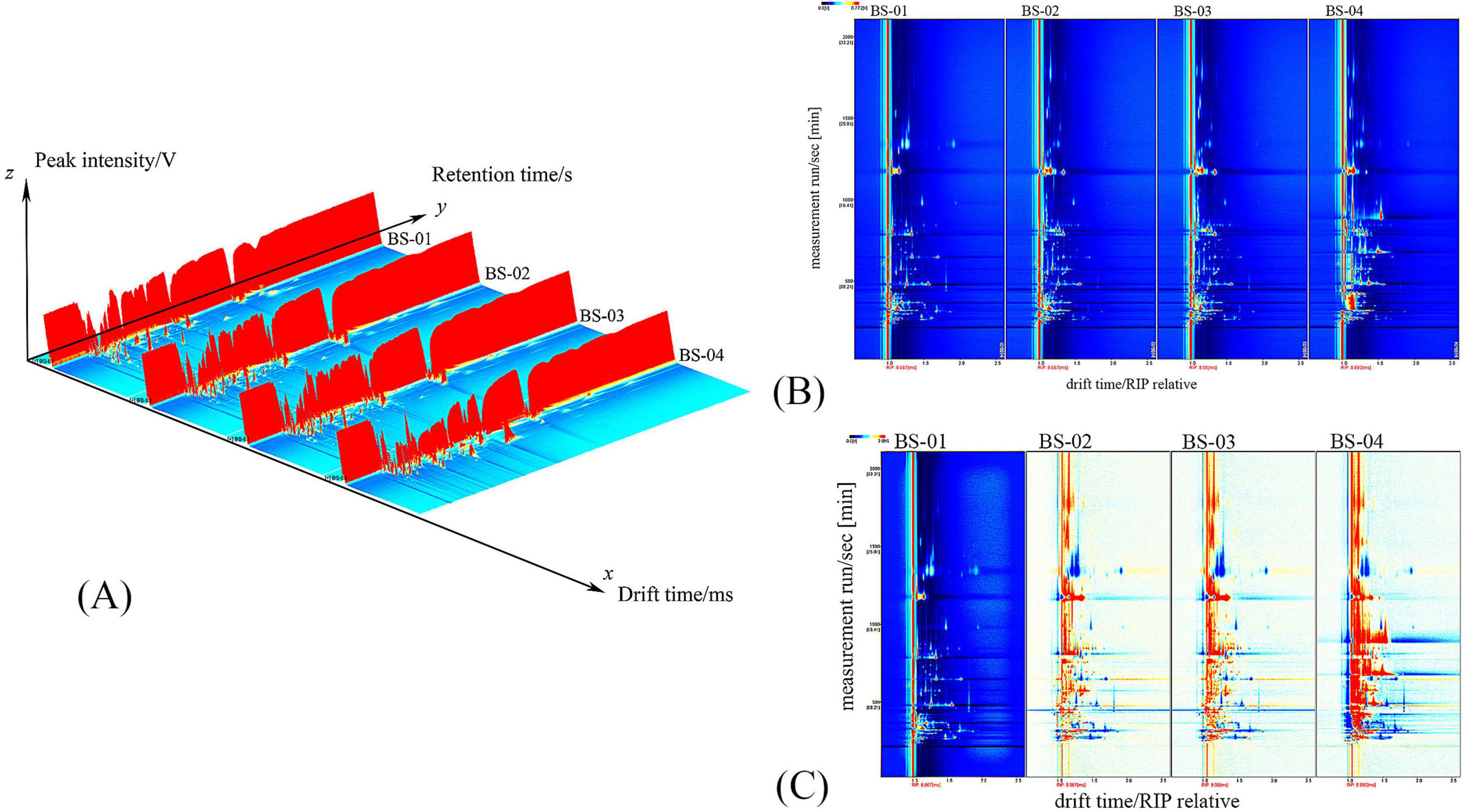 Figure 2B depicts differences in the VOCs of the PRA samples. To facilitate the comparison, the spectrum of the BS-01 sample was chosen as a reference. Spectra of other samples, with the reference spectrum subtracted, were used to create a comparison chart of differences, as shown in Figure 2C. If the volatile organic compound content in the target sample is identical to that in the reference, the subtracted background will be white. Red indicates a higher substance concentration in the target sample than the reference, while blue indicates a lower substance concentration.