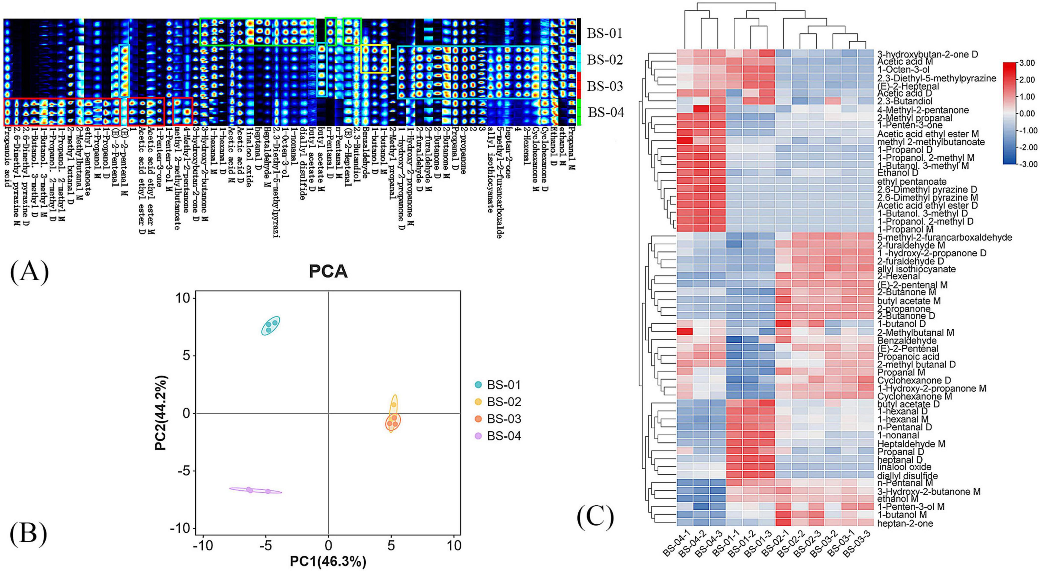 Figure 3A shows the fingerprint of PRA processed using different methods. Each row represents all of the selected signal peaks from a sample, and each column represents the signal peaks of the same volatile organic compound in different samples. The red boxes indicate the following: propanoic acid; 2,6-dimethyl pyrazine M; 2,6-dimethyl pyrazine D; 1-butanol, 3-methyl D; 1-butanol, 3-methyl M; 1-propanol, 2-methyl D; 1-propanol, 2-methyl M; 2-methyl butanal D; 2-methyl butanal M; ethyl pentanoate; 1-propanol M; 1-propanol D; (E)-2-pentenal; acetic acid ethyl ester D; acetic acid ethyl ester M; 1-penten-3-one; methyl 2-methyl butanoate; 4-methyl-2-pentanone. The contents of BS-04 are relatively high. The green boxes indicate the following: 3-hydroxy-2-butanone M; 1-hexanal M; 1-hexanal D; acetic acid M; acetic acid D; linalool oxide; heptanal D; heptaldehyde M; 2,3-diethyl-5-methylpyrazine; 1-octen-3-ol; 1-non-anal; diallyl disulfide; butyl acetate D; n-pentanal D; (E)-2-heptenal; 2,3-butandiol. The contents of BS-01 are relatively high. As shown in the yellow box, benzaldehyde, 1-butanol D, and 1-butanol M are present in higher amounts in BS-02. As shown in the blue boxes, (E)-2-Primary M, butyl acetate M, 1-hydroxy-2-proline D, 1-hydroxy-2-proline M, 2-furaldehyde D, 2-furaldehyde M, 2-butanone D, 2-butanone M, propanal D, 2-propanone, allyl isothiocyanate, 5-methyl-2-furancarboxylic acid, heptan-2-one, 2-hexenal, and cyclohexanone M are present in higher amounts in BS-02 and BS-03.