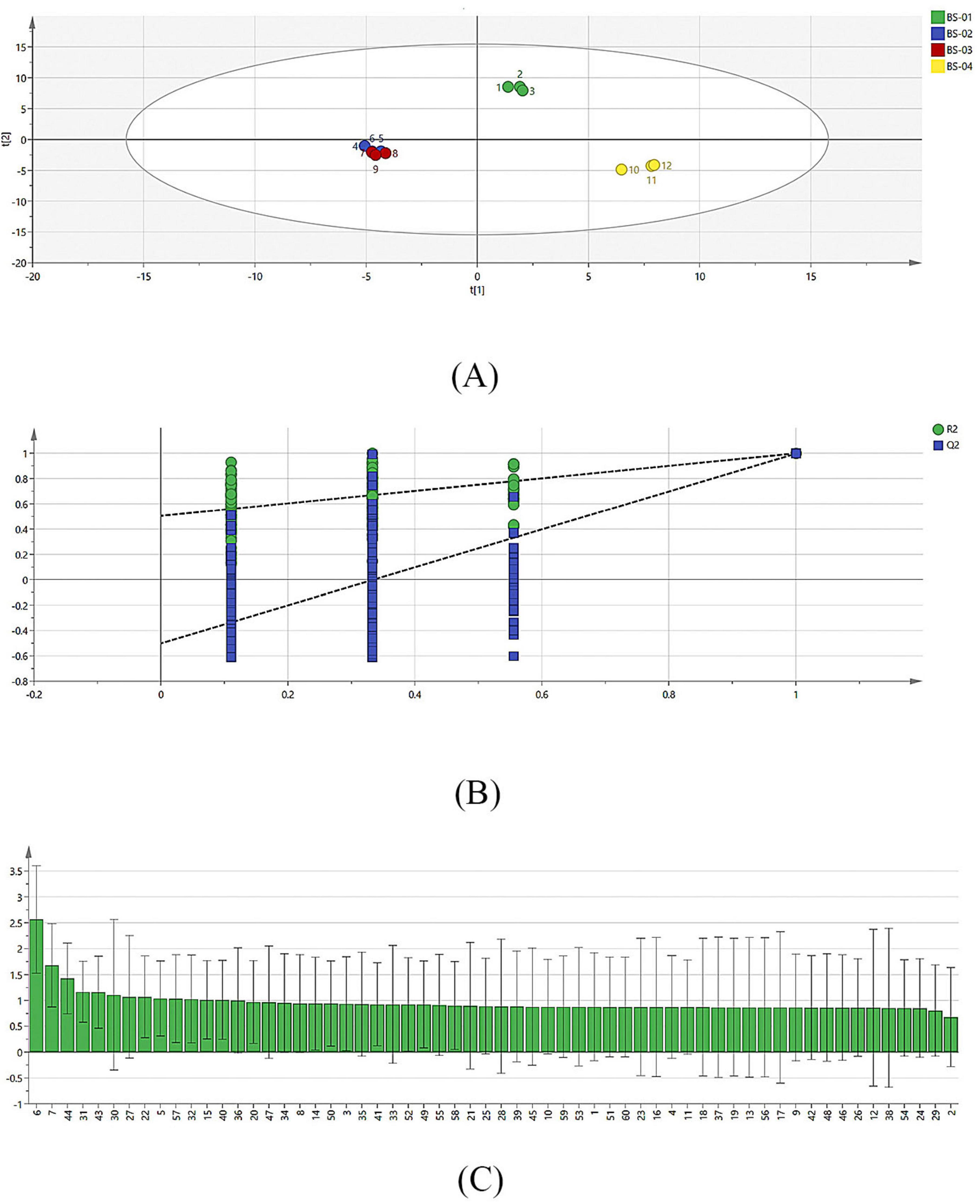 Figure 4. PLS-DA results of VOCs in four samples. (A) PLS-DA models for VOCs in four samples; (B) significance diagnostic: 200 cross-validations were performed using displacement test analysis; (C) the VIP values of VOCs which VIP > 1.
