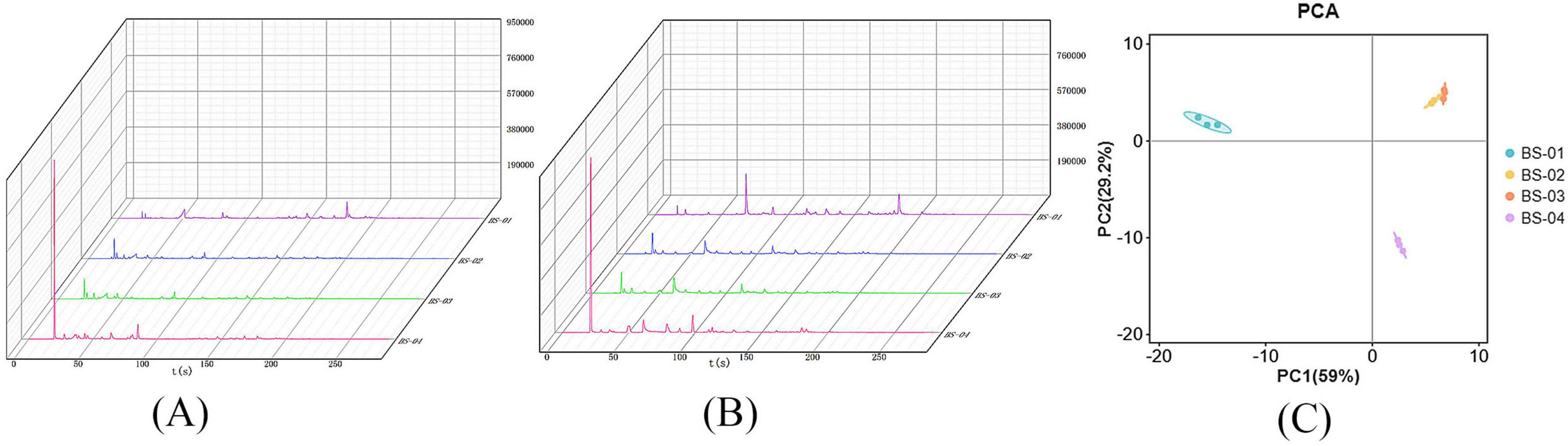 The Heracles NEO ultra-fast gas phase electronic nose contains two ionization detectors: an MXT-5 low-polarity chromatography column and an MXT-1701 medium-polarity chromatography column. To more accurately compare the differences between samples, we analyzed the detection results from both chromatography columns and overlaid the original gas chromatograms of all of the PRA samples. The results are presented in Figures 5A, B. Figures 5A, B displays data from multiple samples, each represented by a distinct color. The gas chromatography overlay visually demonstrates that the detection results of the two chromatography columns are generally similar, but there are differences in the retention time and peak area among the four types of PRA samples. The spectrum shows that the chromatographic peak of the BS-01 sample, represented by purple, is generally low, between 0 and 50 s, with a characteristic peak around 20 s. An analysis of this peak reveals that the chromatographic peak of the BS-04 sample, represented by red, is significantly higher than the peaks of the other three PRA samples. The peak height between 100 and 300 s is relatively low, and the purple BS-01 sample has a characteristic peak. An analysis of the original spectra reveals that the main differences among the four samples of PRA are changes in peak height, reflecting differences in VOCs. To further verify the differences between sample groups, we first used PCA statistics to identify odor differences between sample groups and determine differential chromatographic peaks. Then, we qualitatively analyzed specific chromatographic peaks through database retrieval, thus accurately and effectively identifying differences in the VOCs of PRA processed using different methods.