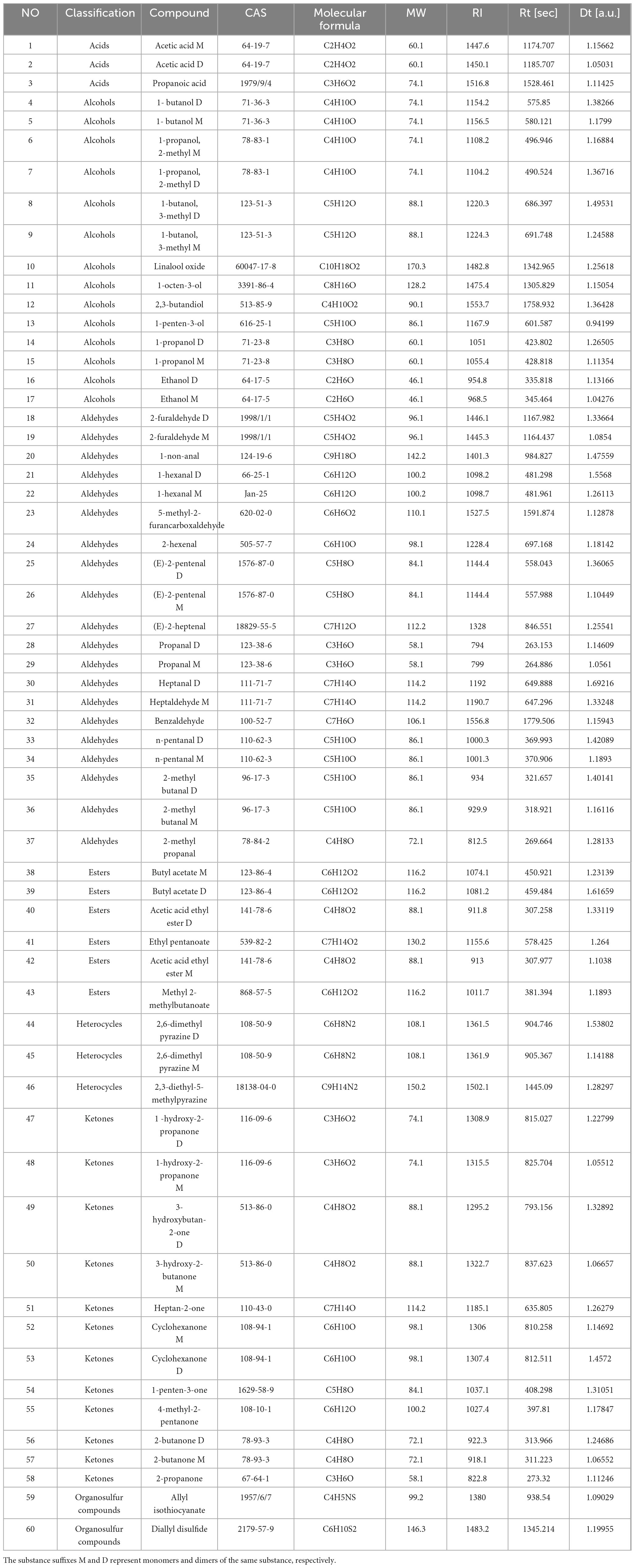 Volatile organic compounds are a crucial class of medicinal ingredients in PRA, but they have poor stability and are prone to volatilization and oxidation during processing. The commonly used methods for detecting VOCs in modern research include electronic noses (16), electronic tongues (17), Gas chromatography-Mass Spectrometry (GC-MS) (18), and Gas chromatography–ion mobility spectrometry (GC-IMS) (19). An E-nose is a device designed to identify and classify odors. The device is built around a series of sensors that detect the presence of odors, especially VOCs. And it generates electrical signals (voltages) called electronic nose data that contain chemical information. In recent years, E-noses have been widely used in food studies (20, 21). GC-IMS is an emerging technique used for the sensitive and selective detection of VOCs. Spectra obtained via GC-IMS are used as “fingerprints” for multivariate chemometric data analysis to extract information (22). Currently, the use of a single analytical technique may not be comprehensive enough to detect some important compounds. As such, the integration of multiple analytical techniques has become a popular research trend, offering more comprehensive, reliable, and scientific information (23).