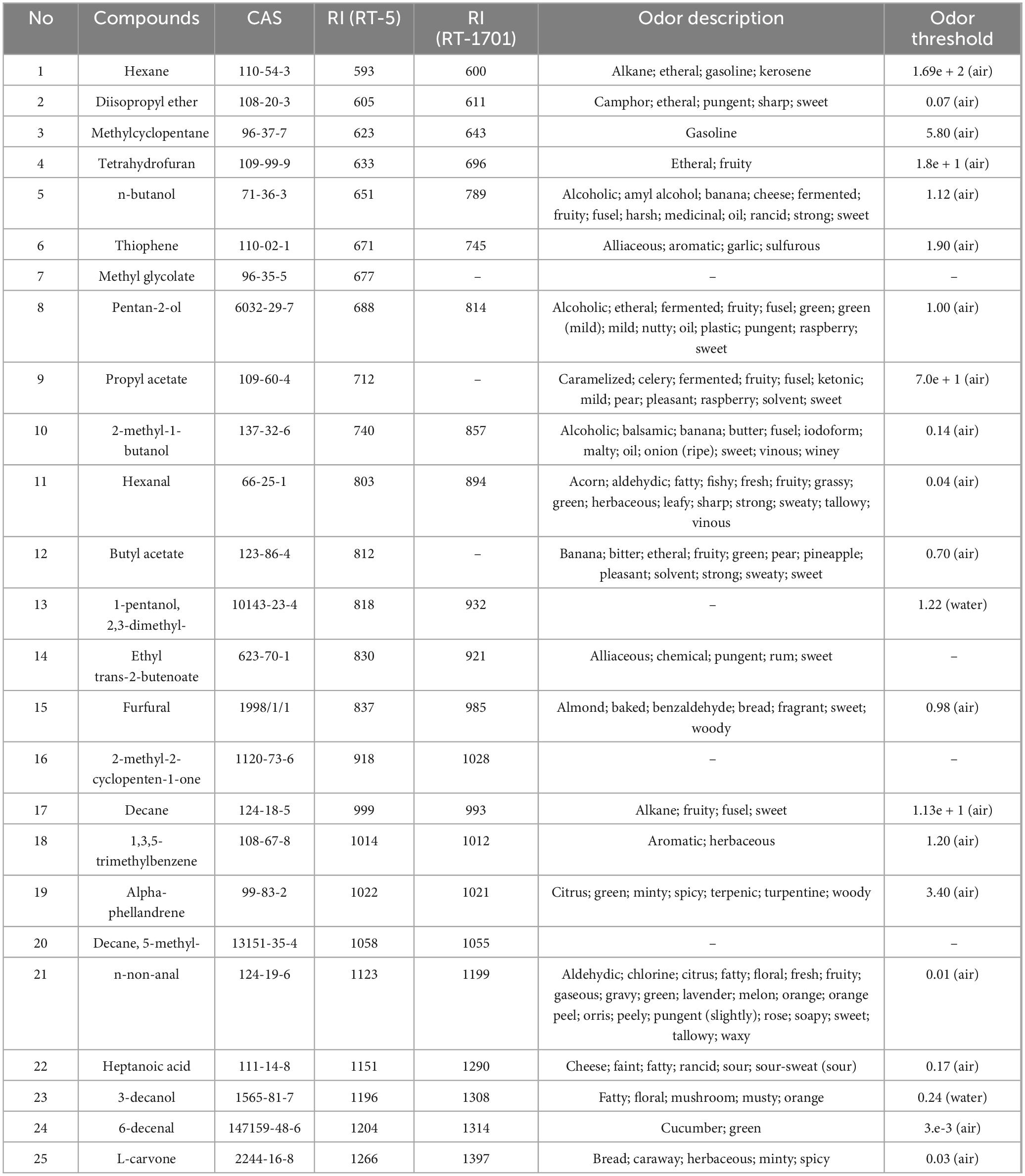 Chromatographic peak analysis was performed using the AroChemBase database to identify compounds with significant differences. Table 2 lists potential compounds based on the qualitative analysis, and the entire compound library was queried using a qualitative search. The threshold size in Table 2 indicates the odor strength. The unit of the threshold is mg/m3 in air and mg/kg in water. Two compounds with the same molecular weight have lower odor thresholds in the same medium, indicating stronger odors. For substances with different contents and thresholds, the odor activity value (OAV) is used. The OAV is the ratio of the sample’s individual substance concentration to its threshold concentration. A high ratio indicates a large OAV and significant odor contribution. A low ratio indicates a small OAV and minimal odor contribution. By knowing each compound’s content in the sample and combining it with the odor threshold, the odor activity value (or odor contribution value) can be calculated. This value guides odor adjustment and has directional significance for odor tracing.