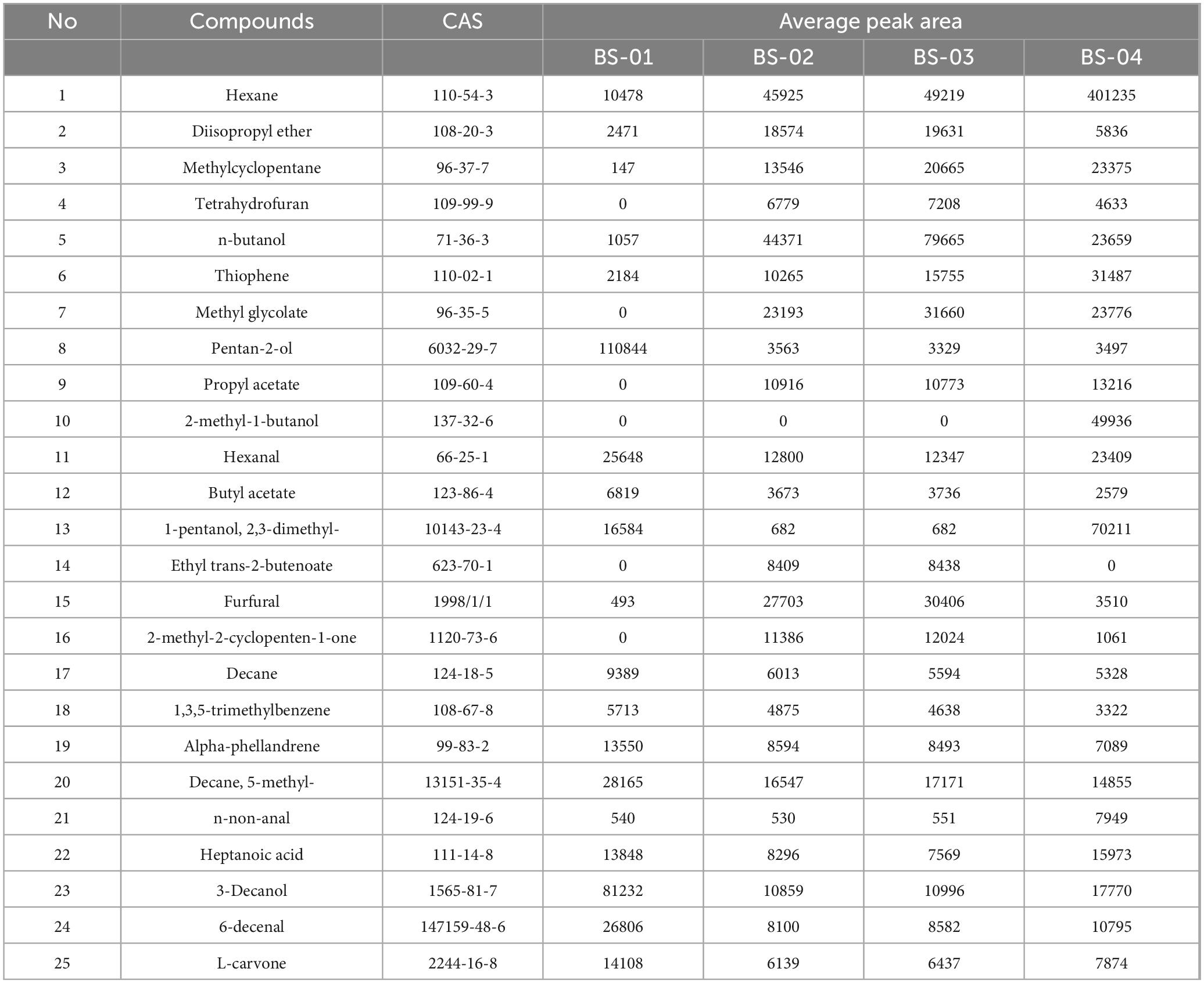 As shown in Table 2, a total of 25 odor components were identified, and it can be seen that BS-04 contains hexane, methylcyclopentane, thiophene, propyl acetate, 2-nethyl-1-butanol, 1-pentanol, 2,3- dimethyl-, n-non-anal, and heptanoic acid. The contents of each compound were the highest in this sample, and hexane was significantly higher in this sample, while the contents of ethyl trans-2-butanoate, furfural, and 2-methyl-2-cyclopenten-1-one were lower in the other three samples. The compound with the highest content in PRA is hexane, with the BS-04 sample having the highest content. In BS-01, the contents of pentan-2-ol, hexanal, butyl acetate, 3-decanol, 6-decenal, L-carvone, decane, 1,3,5-trimethylbenzene, alpha-phellandrene, and 5-methyldecane were higher than those in the other samples. The contents of diisopropyl ether, n-butanol, methyl glycolate, furfural, and 2-methyl-2-cyclopenten-1-one in BS-03 were higher than those in the other samples, while the contents of the other compounds were relatively low. BS-02 did not contain any components that were significantly higher than those in the other PRA samples but contained components similar to those in BS-03. The contents of diisopropyl ether, n-butanol, furfural, and 2-methyl-2-cyclopenten-1-one in BS-02 were higher than those in BS-01 and BS-04 but slightly lower than those in BS-03, and the contents of other compounds were generally lower than those in the other samples. The data in the table show that the chemical compositions of the VOCs in PRA are relatively similar, but there are significant differences among the different processing methods, indicating that there are differences in quality.
