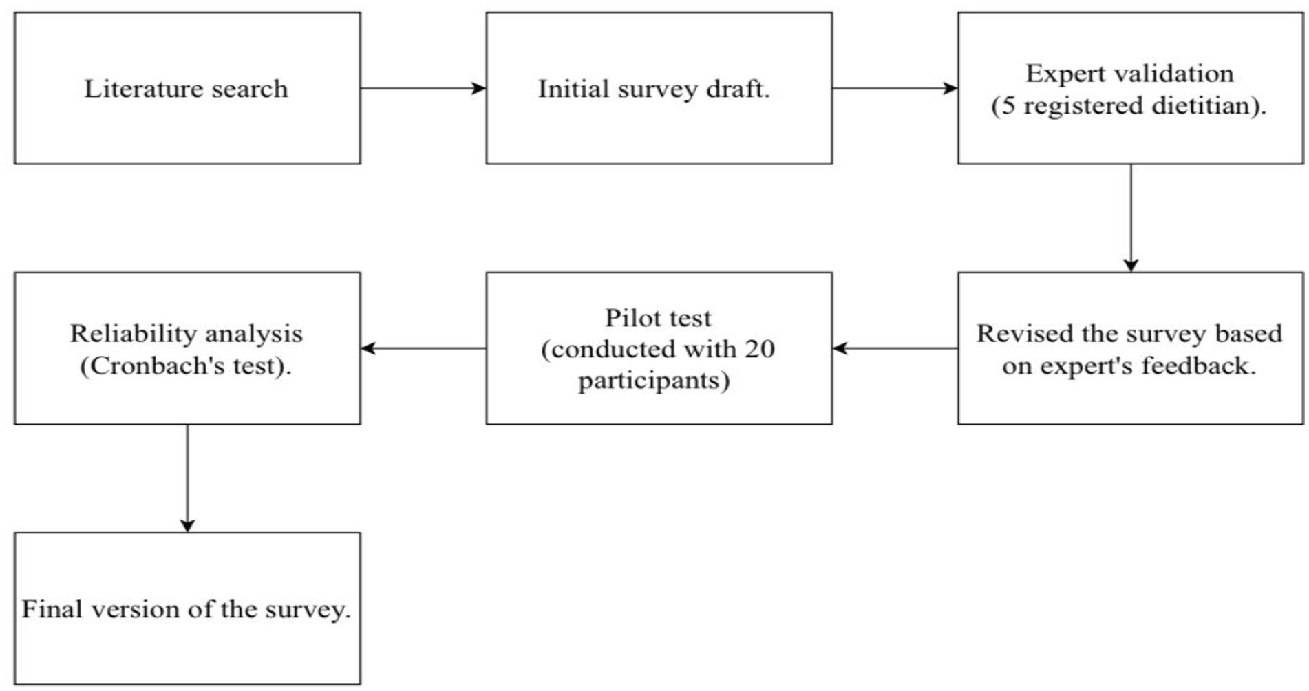 Figure 1 illustrates the step-by-step process followed in the development and validation of the survey instrument. The process began with a literature search and initial survey draft preparation, followed by expert validation by five registered dietitians. Based on expert feedback, the survey was revised and subsequently pilot-tested with 20 participants. Reliability analysis was conducted using Cronbach’s alpha, leading to the final version of the survey.