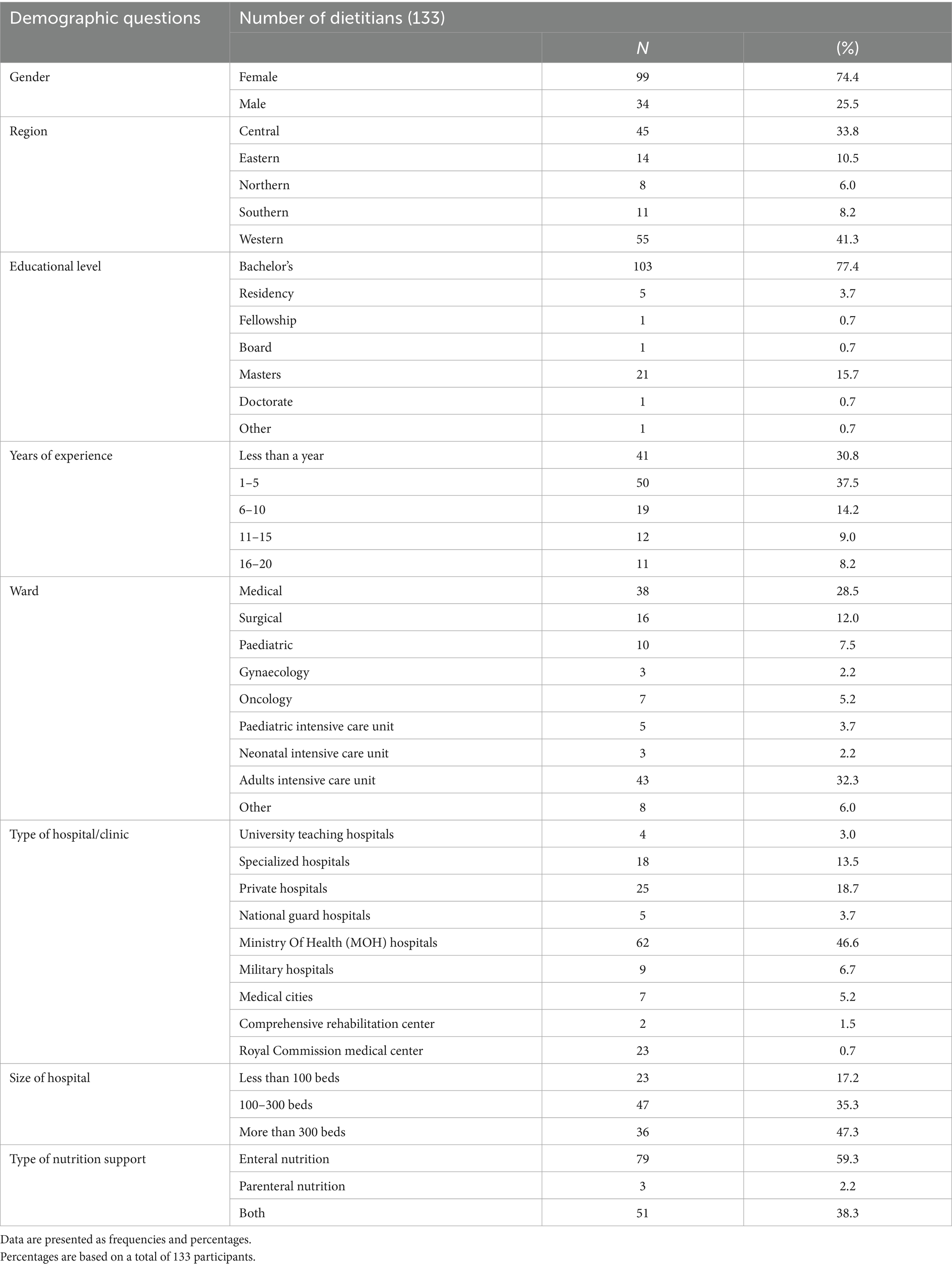 A total of 209 dietitians were initially screened for eligibility. Of these, 76 were excluded as they were either not RDs (n = 56) or were RDs who did not provide nutrition support in their clinical practice (n = 20) (11), resulting in a final sample of 133 participants included in the analysis. The majority of participants were female (74.4%), while 25.5% were male. The sample included dietitians from various regions across Saudi Arabia, with the western region representing the largest proportion (41.3%), followed by the central (33.8%), eastern (10.5%), southern (8.2%), and northern (6.0%) regions. This geographic distribution broadly reflects the demographic composition of the clinical nutrition workforce in the country. The general characteristics of the study participants are presented in Table 1.