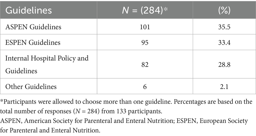 Among the 284 recorded responses regarding guideline usage (as participants were allowed to select more than one guideline), the American Society for Parenteral and Enteral Nutrition (ASPEN) guidelines emerged as the most utilised, reported by 35.6% of participants, followed closely by the European Society for Clinical Nutrition and Metabolism (ESPEN) guidelines (33.5%). Internal hospital policies and protocols accounted for 28.9% of the responses. Only 2.1% of participants indicated the use of alternative guidelines (Table 2).