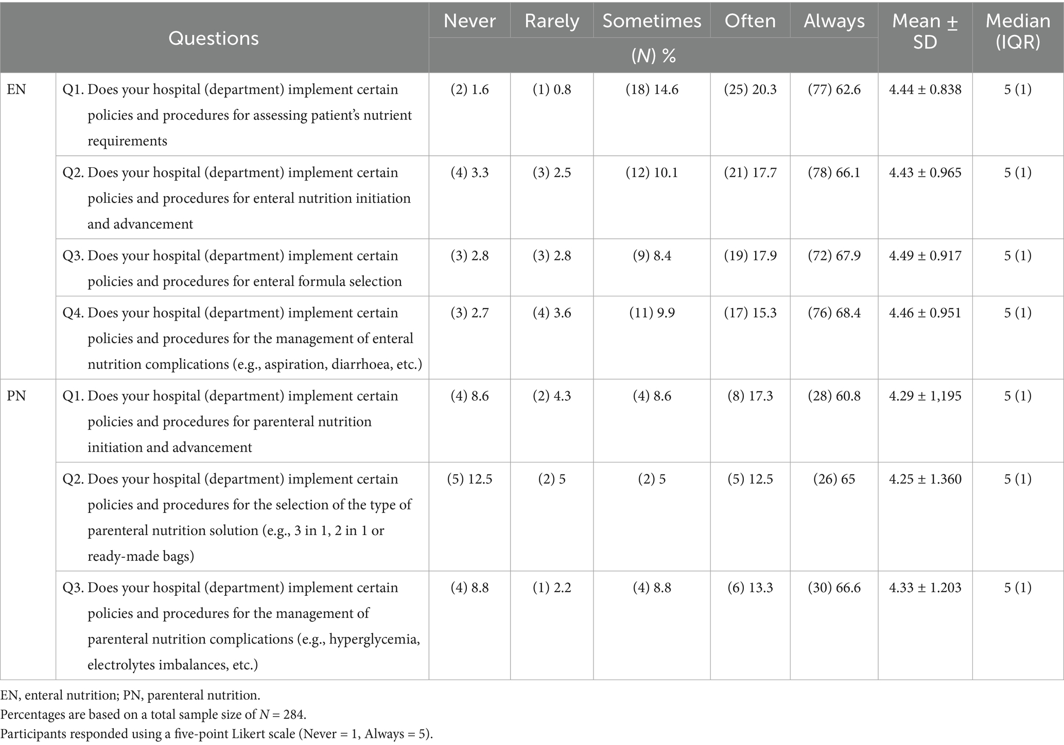 Regarding adherence to NS guidelines or protocols, participants demonstrated equally strong compliance with both EN and PN protocols, with a median adherence score of 5.00. Across all EN-related questions, the majority of the responses were “Always” ranging from 62.6% to 68.4% indicating strong adherence to policies regarding nutrient assessment, initiation and advancement, formula selection, and complication management. The median score for each EN question was 5, with a mean ranging from 4.43 to 4.49 and relatively low standard deviations, suggesting consistency across responses. Similarly, strong adherence to PN-related practices was reported, with the frequency of “Always” responses ranging from 60.8% to 66.6%. The median score for all PN-related items was also 5, while mean scores ranged from 4.25 to 4.33 (Table 3).
