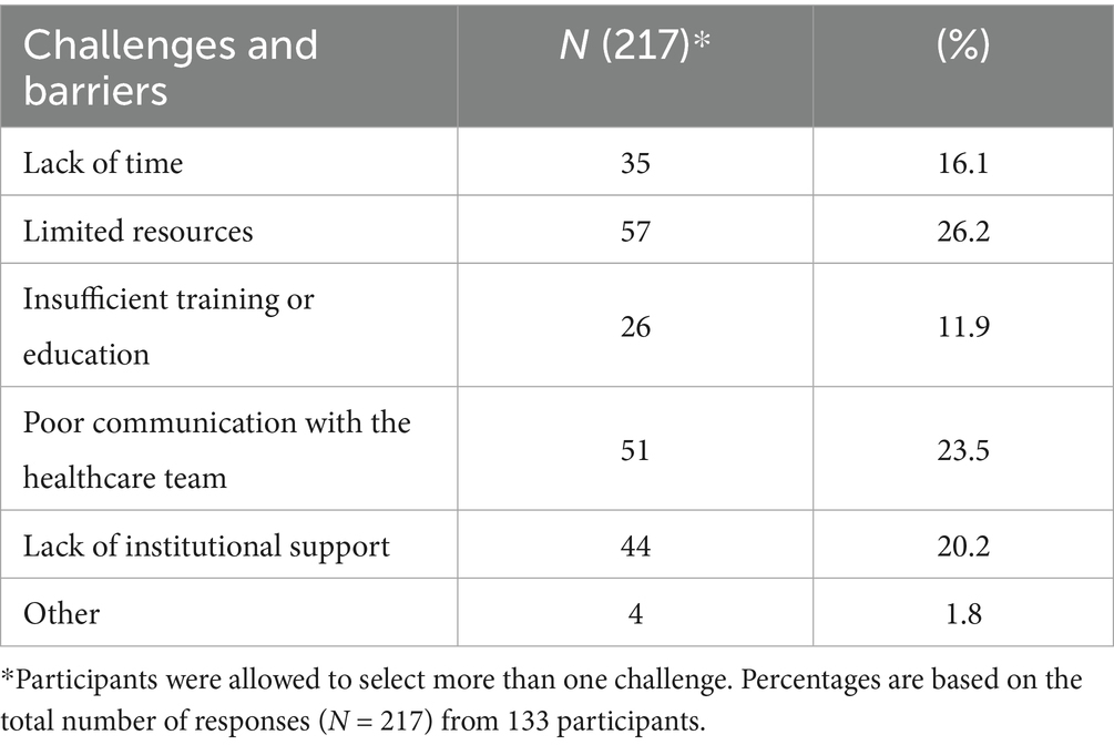 The results revealed several perceived barriers and challenges affecting the dietitians’ adherence to NS guidelines or protocols. The most frequently reported barrier was limited resources, cited by 26.2% of participants. This was followed by poor communication with the healthcare team (23.5%), as a notable challenge. Specifically, when participants were asked about the frequency of resistance from other healthcare professionals, a majority (60.9%) reported encountering this issue sometimes, with a mean score of 3.02 ± 0.995, suggesting a moderate yet prevalent obstacle. Additionally, a lack of institutional support was reported by 20.2% of respondents (Table 4). The participants’ responses to queries about access to ongoing education or workshops on NS varied considerably. Only 30.8% reported that their hospitals always provide such educational opportunities, while 32.3% indicated that this occurs sometimes, and 23.3% reported that it occurs rarely. Notably, 13.5% of participants stated that they had never received any ongoing education or training related to NS.
