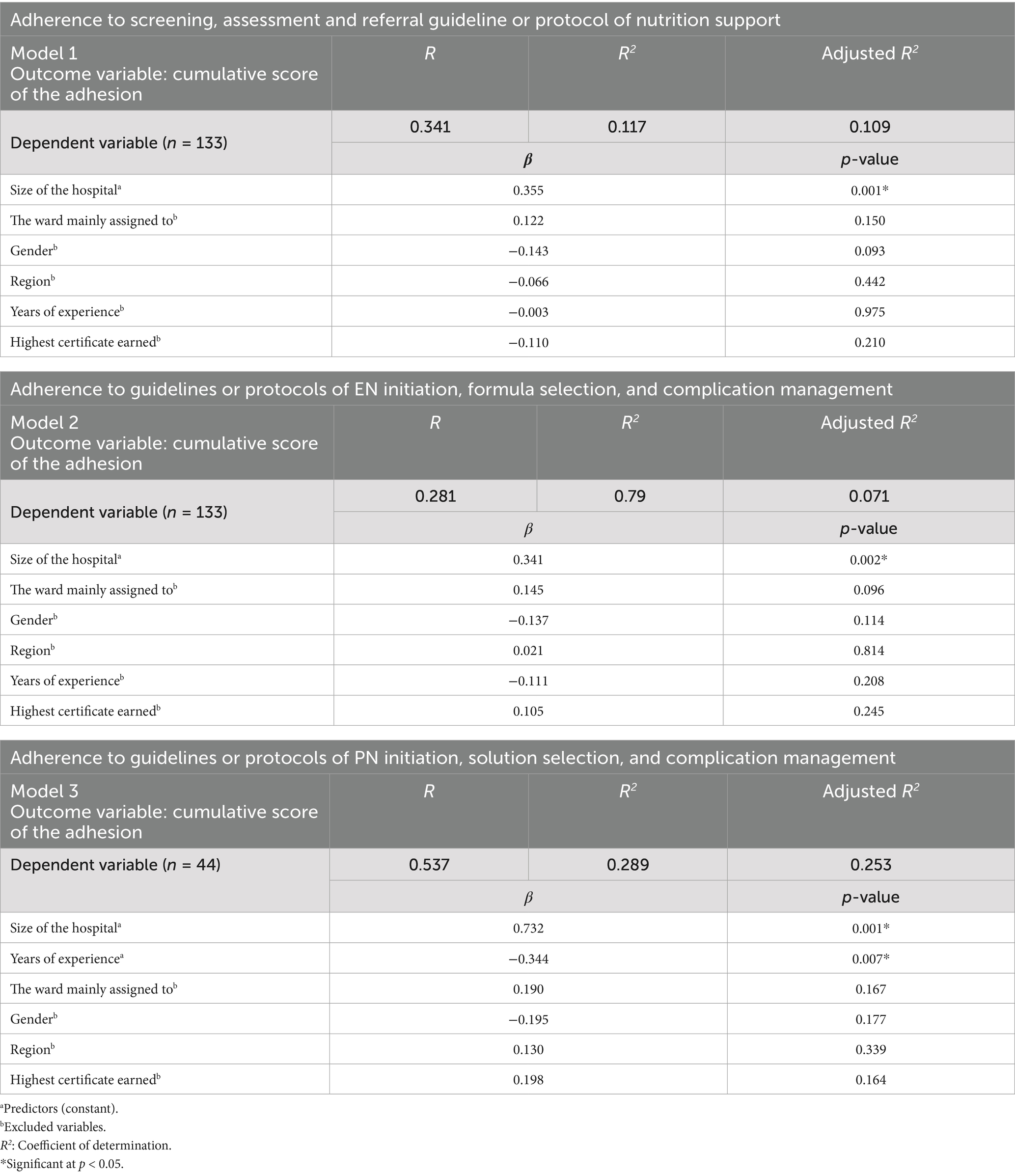 Table 5. Regression analysis to identify the factors affecting the dietitians’ adherence to nutrition support guidelines or protocols.