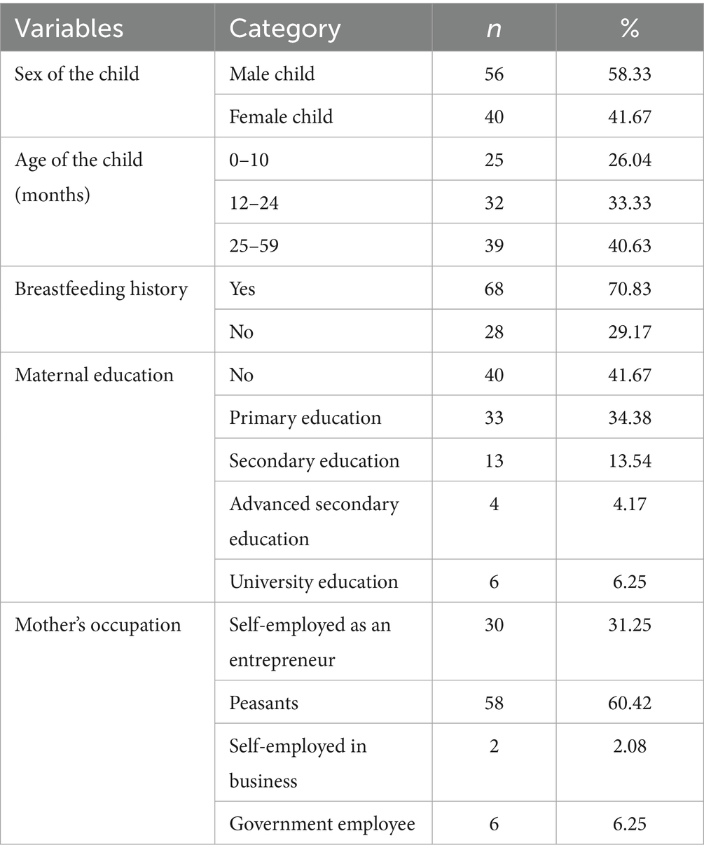 Of the 96 children included in this study, the majority, 39 (40.63%), were aged 25–59 months. Both sexes were represented, with 56 (58.33%) male and 40 (41.67%) female individuals. The majority of the children, 68 (70.83%), had a breastfeeding history, while 28 (29.17%) had no breastfeeding history. The majority of the parents/caregivers, 40 (41.67%), had no formal education, 33 (34.38%) had primary education, 13 (13.54%) had secondary education, 6 (6.25%) had university education, and only 4 (4.17%) had advanced education. The majority of the mothers, 58 (60.42%), were engaged in peasant occupations (Table 1).