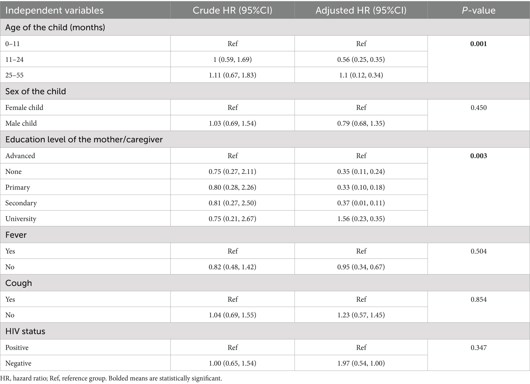 Table 2. Cox proportional hazards regression results show the factors associated with recovery from SAM among the children (0–59 months) at Dodoma and Iringa hospitals during admission, 2022 (n = 96).