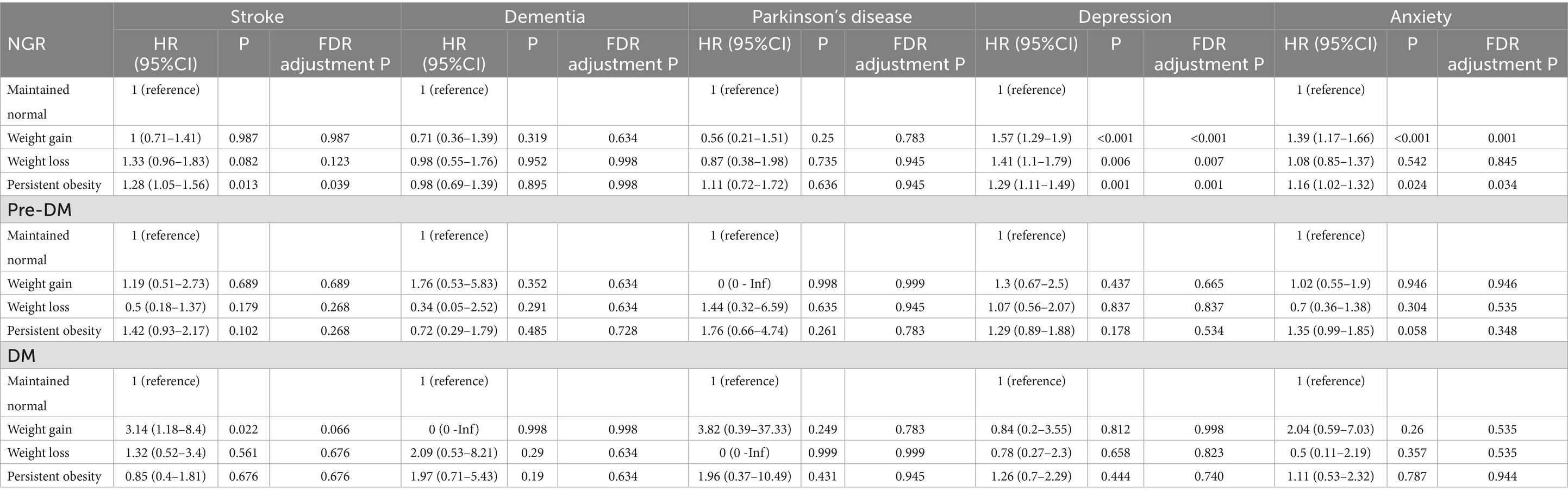 The association of changes in weight with neuropsychiatric health was shown in Table 1. Among individuals with NGR, both weight gain and persistent obesity were significantly associated with increased risks of depression (HR = 1.57, 95% CI: 1.29–1.90 and HR = 1.29, 95% CI: 1.11–1.49, respectively) and anxiety (HR = 1.39, 95% CI: 1.17–1.66 and HR = 1.16, 95% CI: 1.02–1.32, respectively). Weight loss was also associated with a significantly increased risk of depression (HR = 1.41, 95% CI: 1.10–1.79), though its effect on anxiety was not statistically significant. For stroke, only persistent obesity showed a significant association (HR = 1.28, 95% CI: 1.05–1.56), while no significant associations were observed for dementia or Parkinson’s disease across all weight change groups in this subgroup.