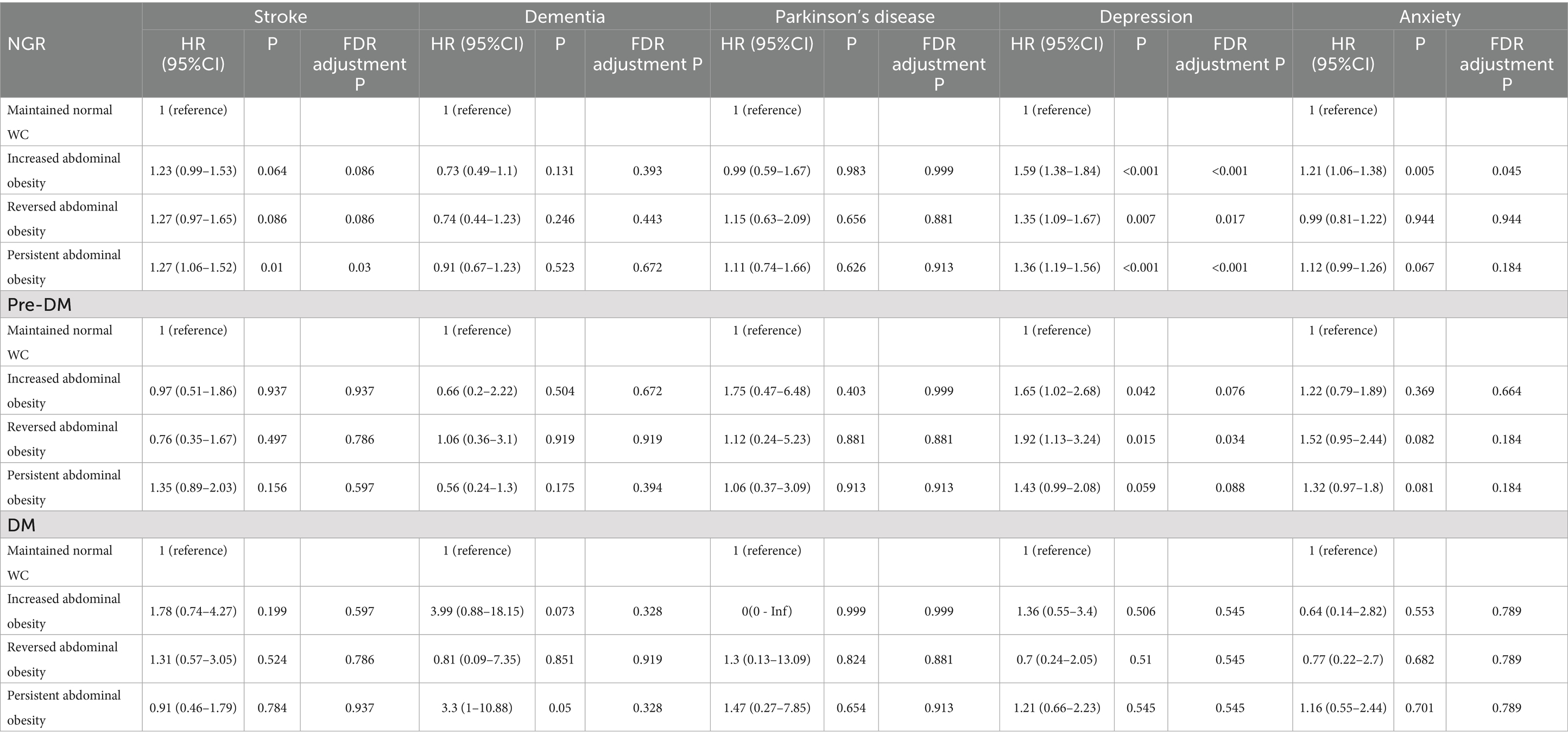 The association of changes in abdominal obesity with neuropsychiatric health was shown in Table 2. In individuals with NGR, increased abdominal obesity was significantly associated with higher risks of depression (HR = 1.59, 95% CI: 1.38–1.84) and anxiety (HR = 1.21, 95% CI: 1.06–1.38), while reversed abdominal obesity also conferred elevated risks for depression (HR = 1.35, 95% CI: 1.09–1.67). Persistent abdominal obesity was linked to significantly increased risks of stroke (HR = 1.27, 95% CI: 1.06–1.52) and depression (HR = 1.36, 95% CI: 1.19–1.56), and showed a borderline association with anxiety (HR = 1.12, 95% CI: 0.99–1.26). No statistically significant associations were observed with dementia or Parkinson’s disease in this subgroup. Among prediabetic individuals, increased abdominal obesity was significantly associated with a higher risk of depression (HR = 1.65, 95% CI: 1.02–2.68). Reversed abdominal obesity was also significantly linked to an increased risk of depression (HR = 1.92, 95% CI: 1.13–3.24). In the DM group, no associations were observed between changes in abdominal obesity and any neuropsychiatric health outcomes.