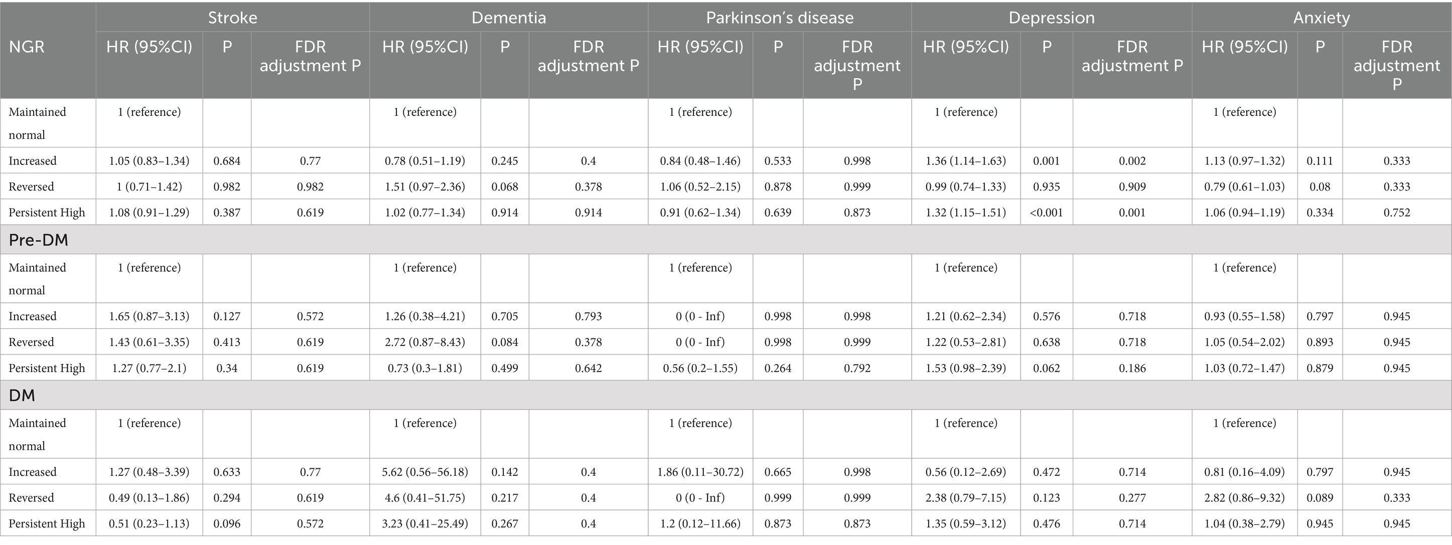 The association of changes in body fat percentage with neuropsychiatric health was shown in Table 3. While changes in body fat percentage showed no significant association with most neuropsychiatric outcomes, increased (HR 1.36, 95% CI 1.14–1.63) and persistently high body fat (HR 1.32, 95% CI 1.15–1.51) were significantly associated with an elevated risk of depression in individuals with NGR.
