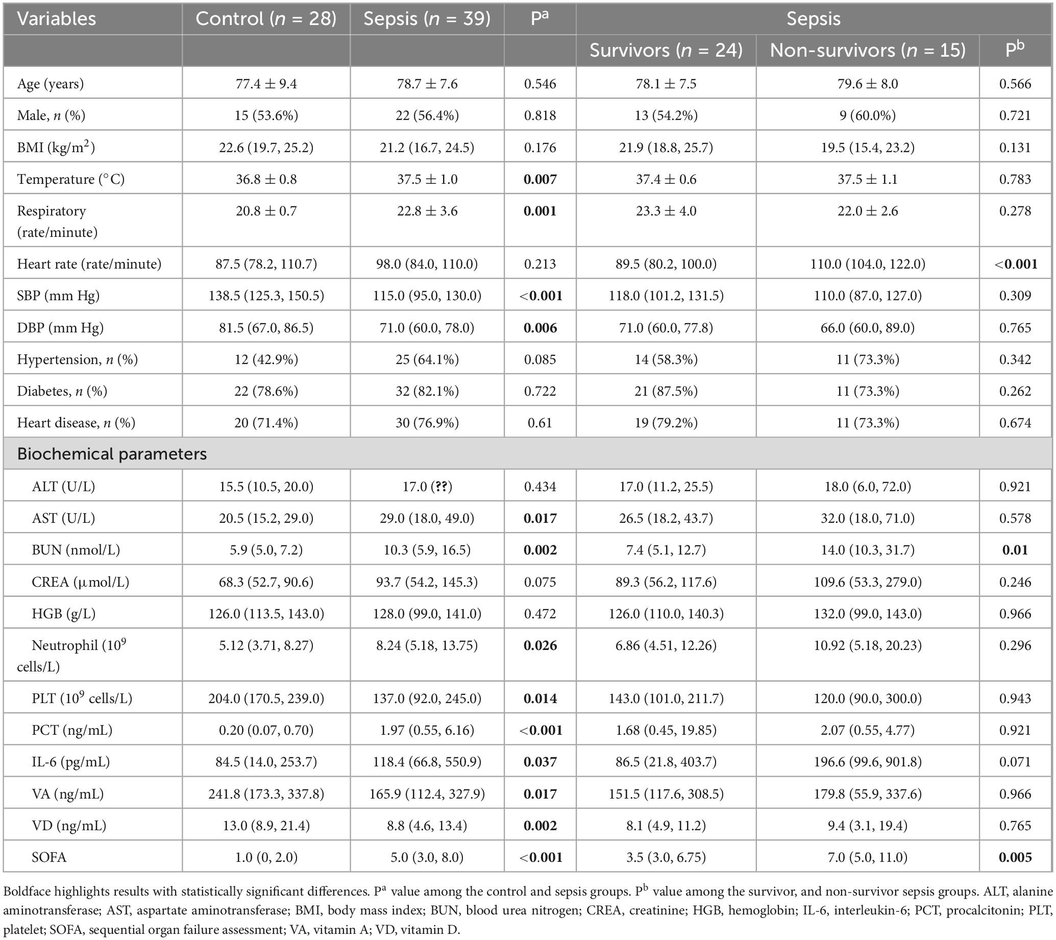 This research included 39 geriatric patients diagnosed with sepsis and 28 patients with general infections, all aged more than 60. The Sepsis group contained people who met the sepsis diagnostic standards, whereas the Control group contained people with infections but not diagnosed with sepsis. In the sepsis group, 15 experienced in-hospital mortality. The baseline traits are detailed in Table 1. Compared to the Control group, the Sepsis group exhibited significantly higher body temperature, respiratory rate, AST, BUN, neutrophil counts, PCT, and SOFA scores (P < 0.05), along with significantly lower PLT counts, SBP, DBP, and serum levels of VA and VD (P < 0.05). No significant differences were observed in BMI, HGB, or the prevalence of diabetes mellitus, hypertension, or heart disease between the two groups (P > 0.05). Within the Sepsis group, non-survivors had significantly higher heart rate, BUN levels, and SOFA scores than survivors (P < 0.05). However, no other clinical characteristics, including ALB levels, differed significantly between survivors and non-survivors (P > 0.05).